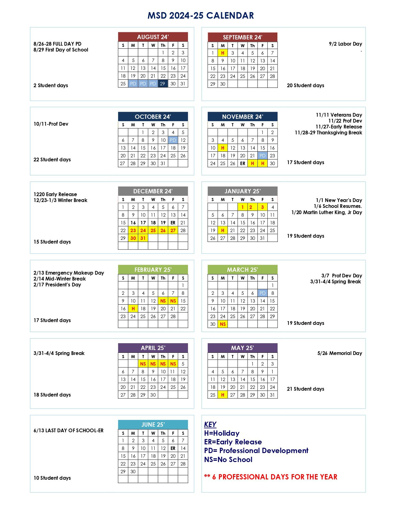 Winter Break for MSD Schools Calendar 2024-2025 is from December 23, 2024, to January 3, 2025. [cite: 7, 11]