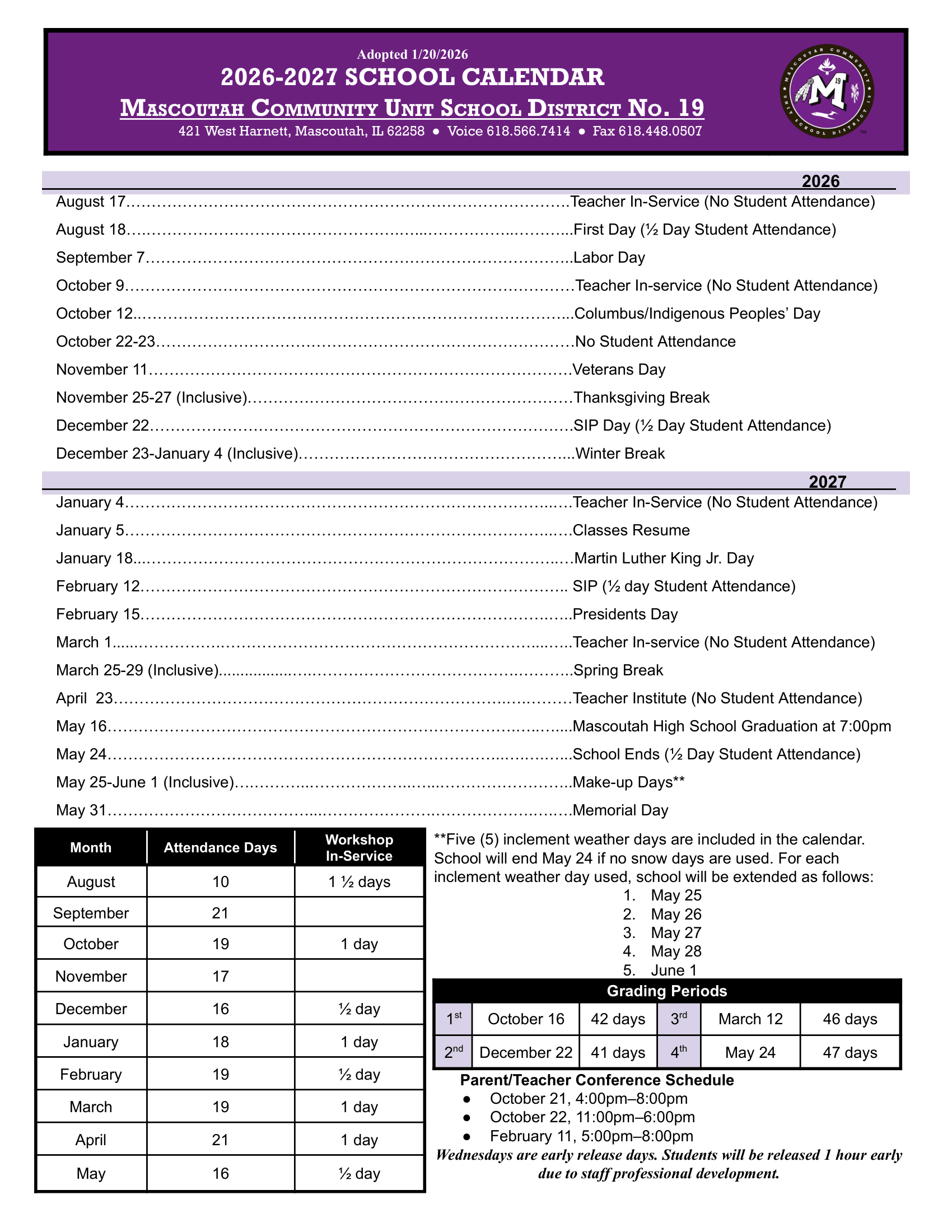 Dates are sourced from the official Mascoutah Community Unit School MSD 19 Calendar 26-27 [PDF] website. Dates may change at the discretion of the district. Always verify with the official school website for the latest updates.