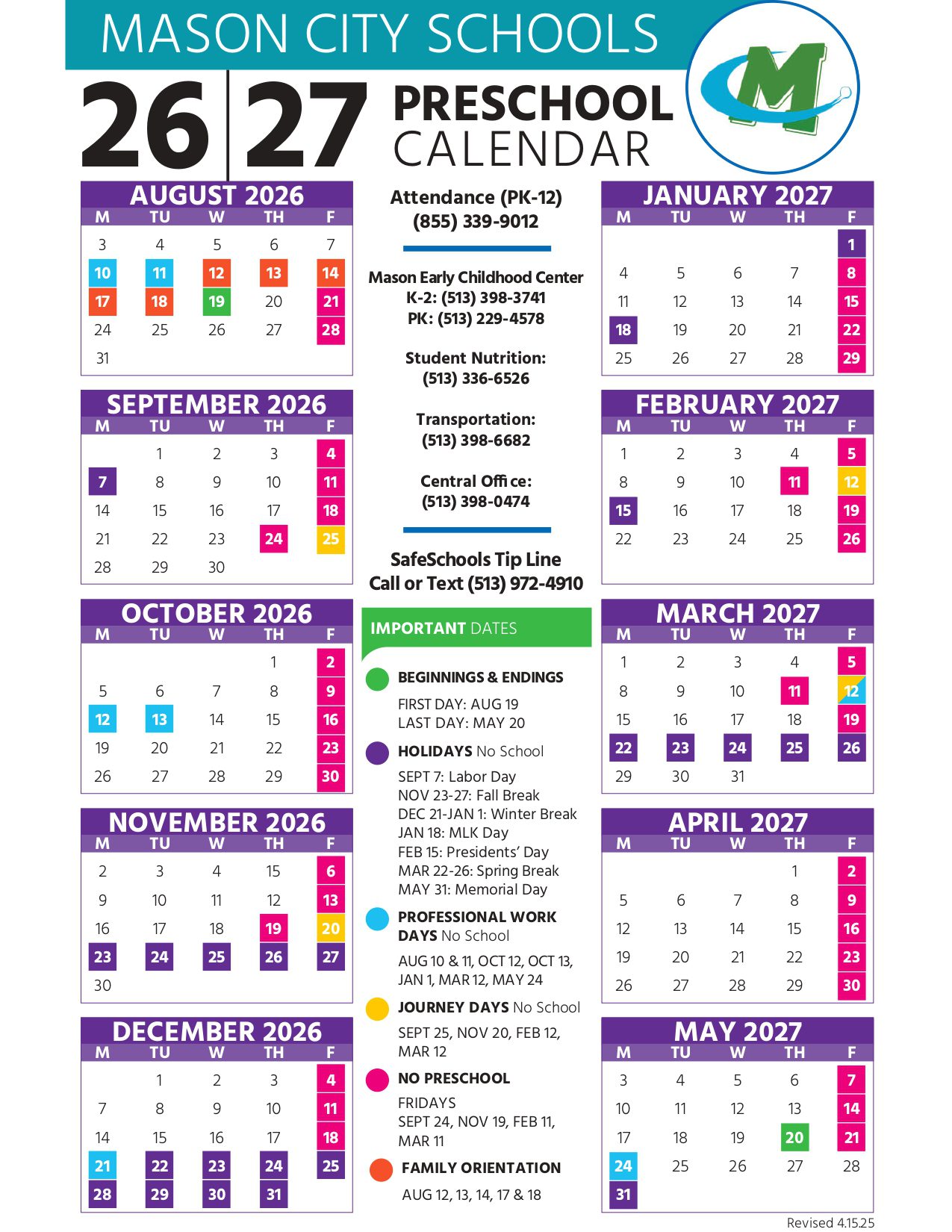 Mason City Schools 2026-2027 Preschool Calendar FAQ