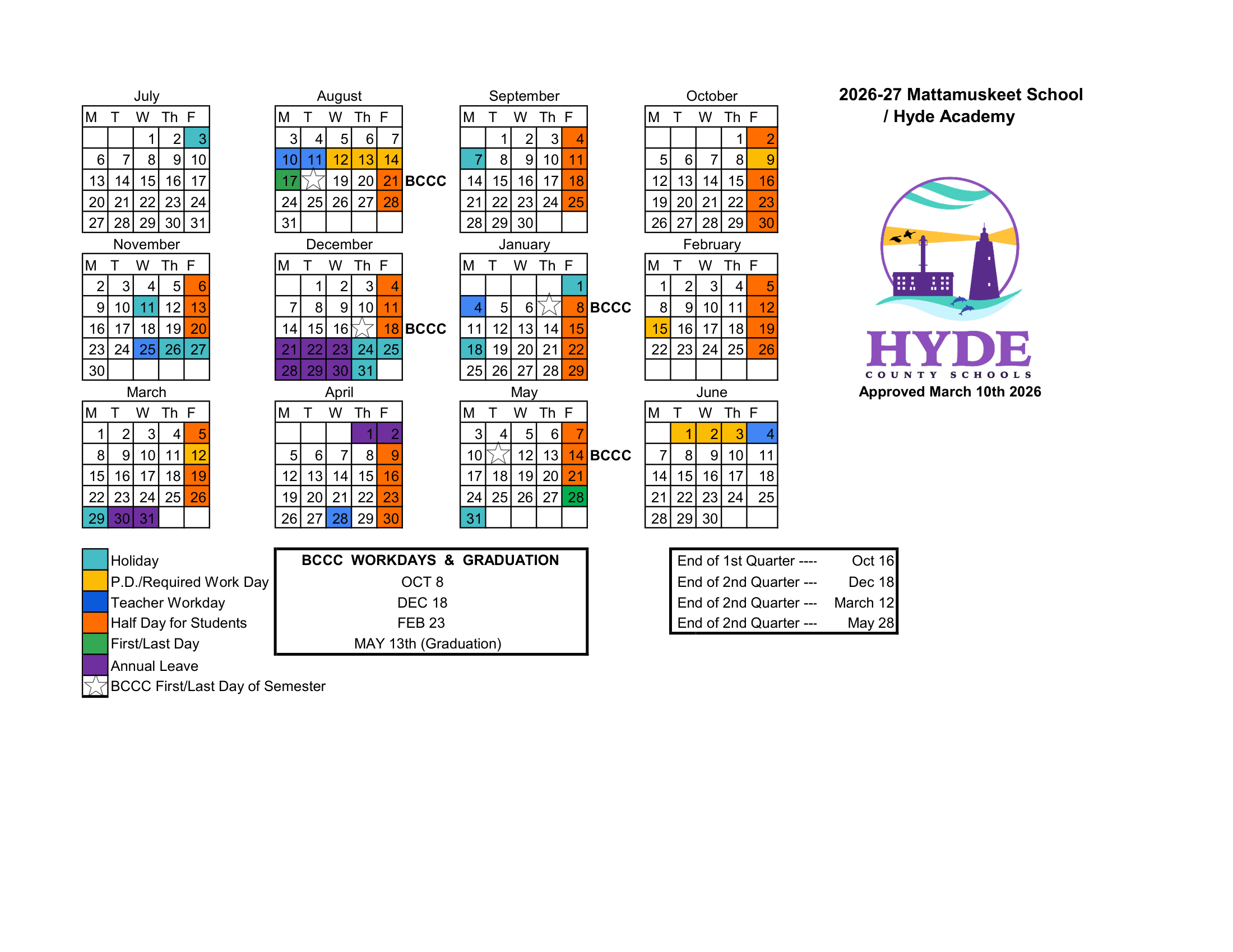 Mattamuskeet School / Hyde Academy Calendar 2026-2027 FAQ