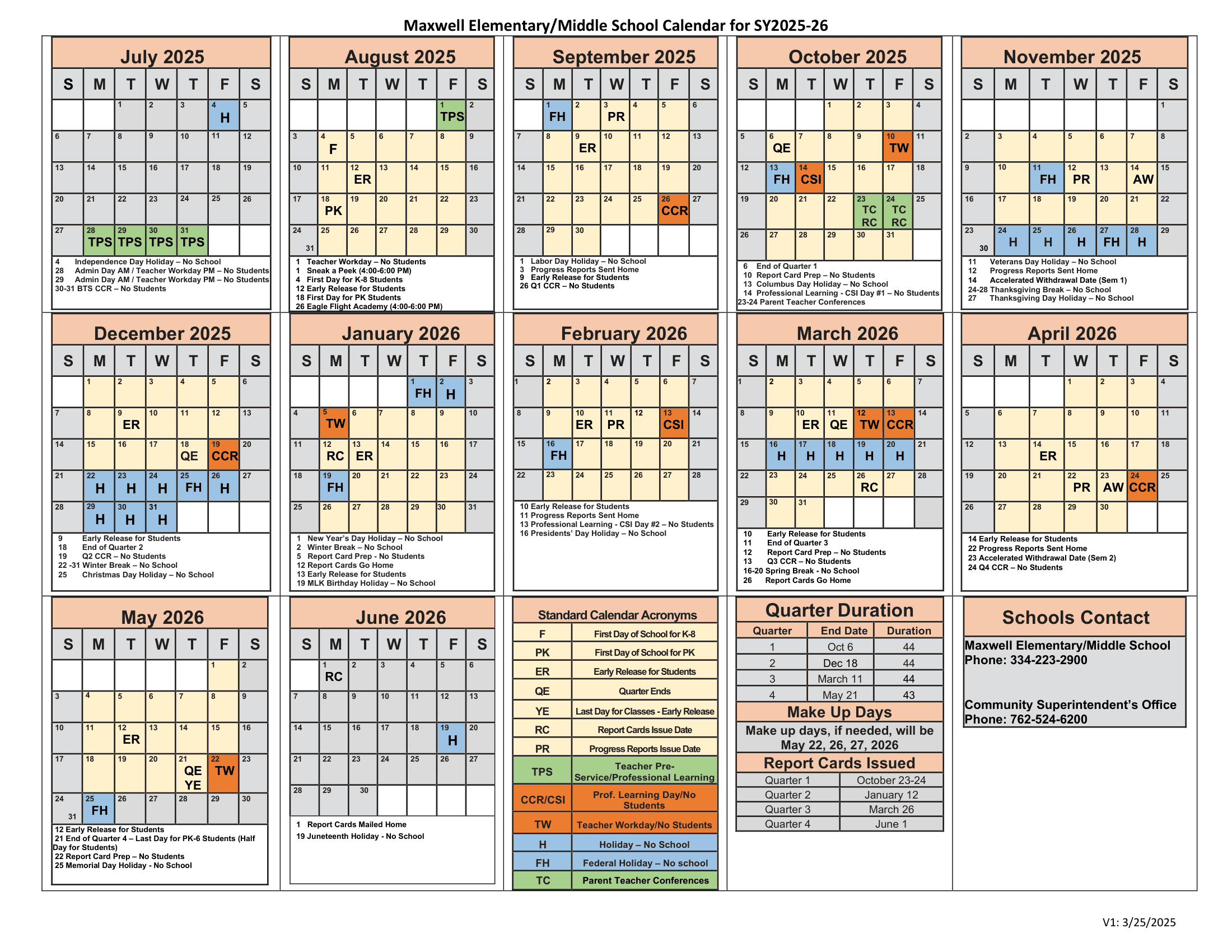 Dates are sourced from the official Maxwell Elementary-Middle School DoDEA 25-26 Calendar Updates [PDF] website. Dates may change at the discretion of the district. Always verify with the official school website for the latest updates.