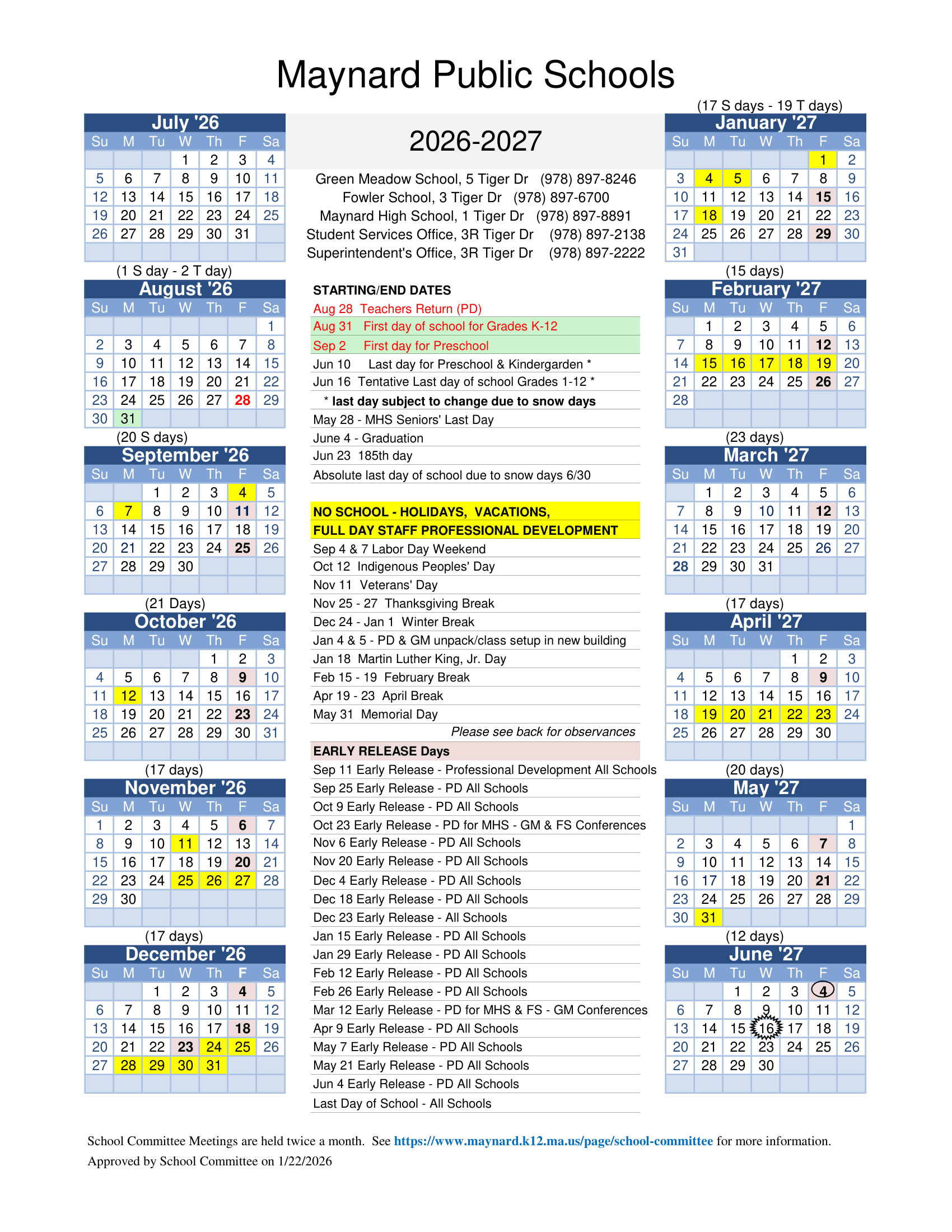 The Printable school calendar provided on this page is taken from the official Maynard Public Schools Calendar 26-27 Updates. Please note that all dates and events are subject to change at the discretion of the school district. For the most accurate and updated information, please refer to the official district website or contact the school helpline.