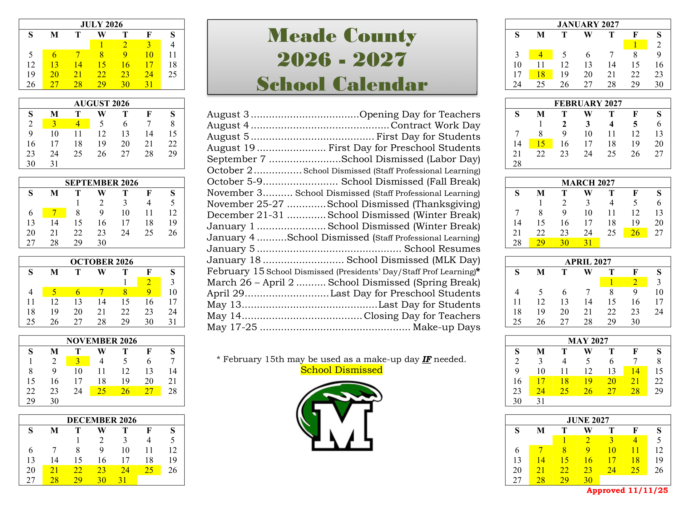 Dates are sourced from the official Meade County School 26-27 Calendar Updated [PDF] website. Dates may change at the discretion of the district. Always verify with the official school website for the latest updates.
