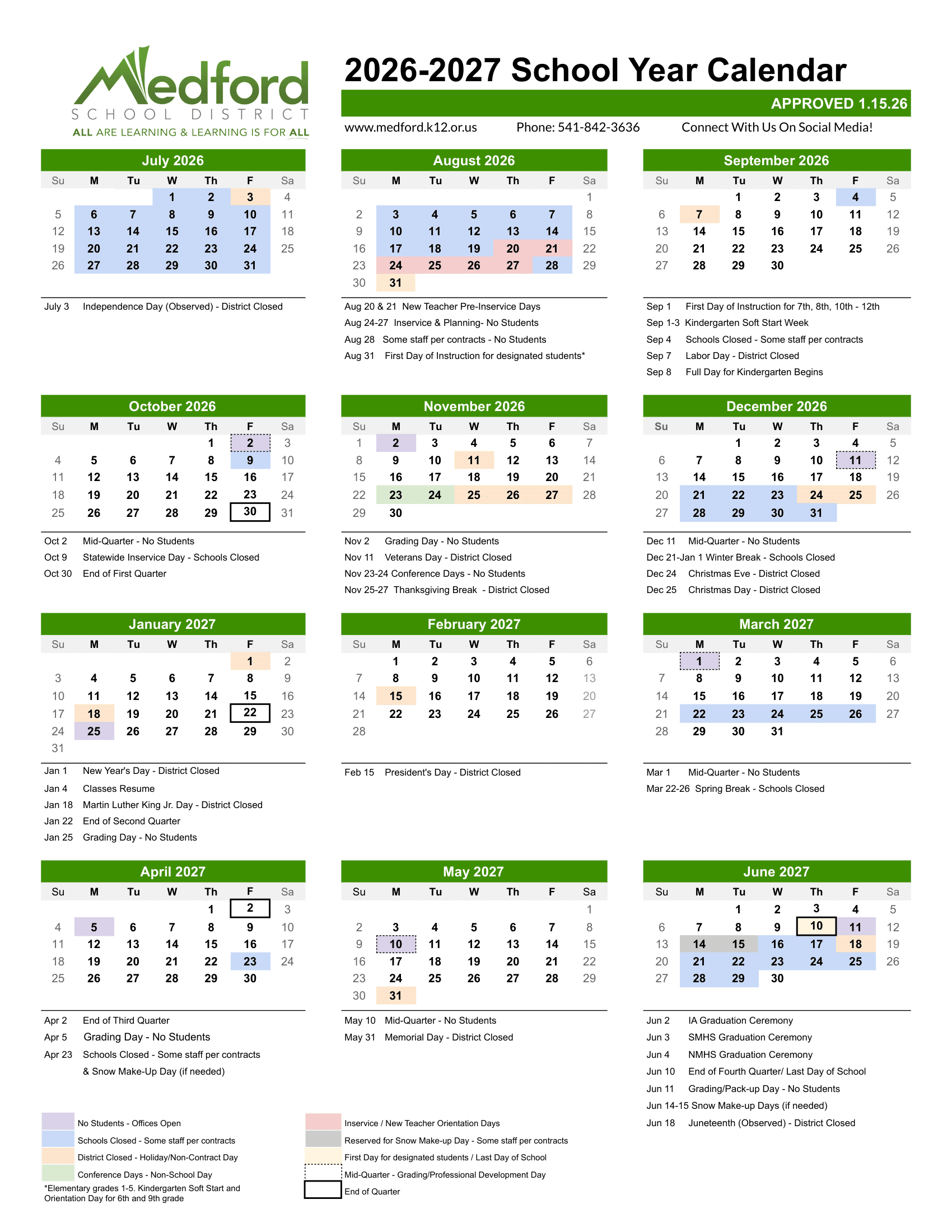 Dates are sourced from the official Medford School District, OR Calendar 26-27 Updated [PDF] website. Dates may change at the discretion of the district. Always verify with the official school website for the latest updates.