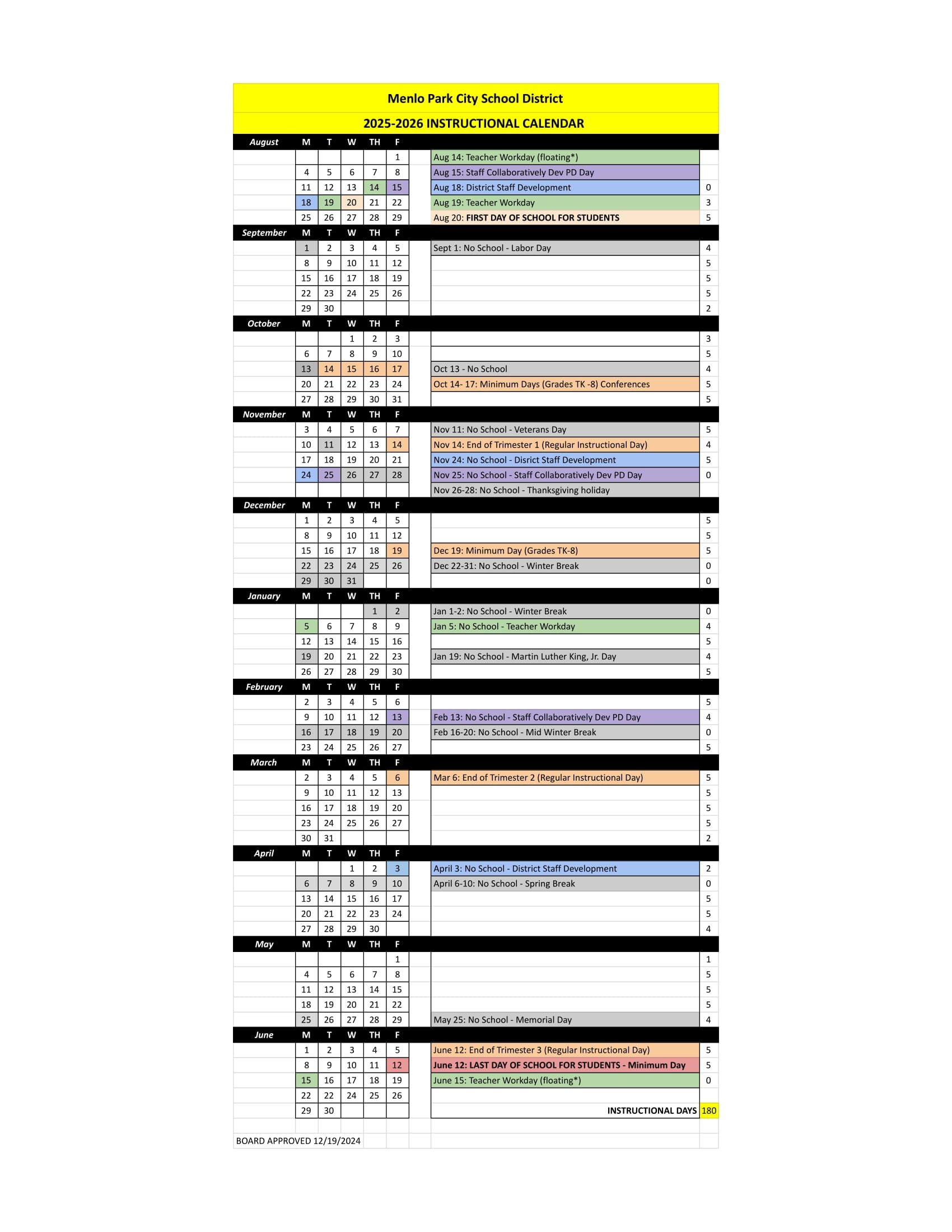 The school calendar provided on this page is taken from the official Menlo Park City School District. Please note that all dates and events are subject to change at the discretion of the school district. For the most accurate and updated information, please refer to the official district website or contact the school helpline.