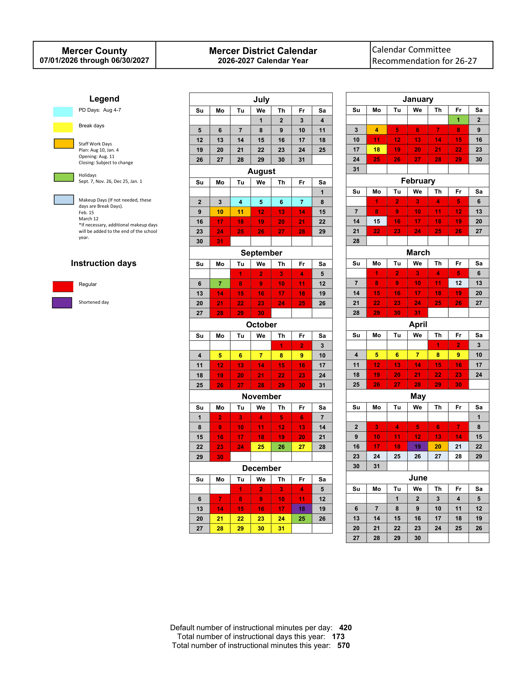 The Printable school calendar provided on this page is taken from the official Mercer County Schools ky Calendar 26-27 Updates. Please note that all dates and events are subject to change at the discretion of the school district. For the most accurate and updated information, please refer to the official district website or contact the school helpline.