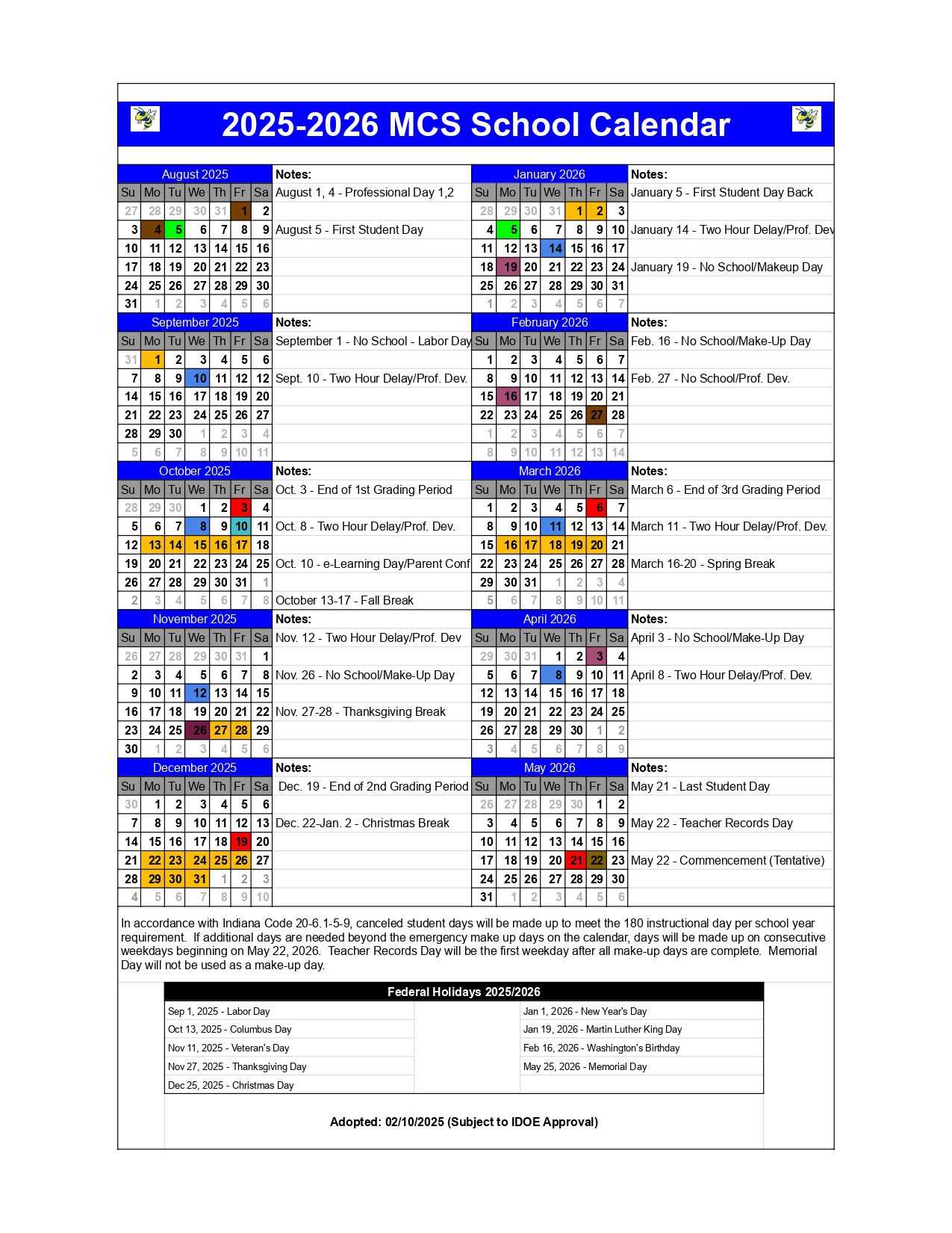 MCS School Calendar (2025-2026)