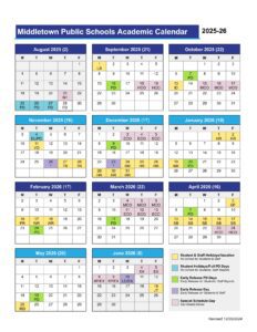 The printable school calendar provided on this page is taken from the official Middletown Public Schools Calendar website. Please note that all dates and events are subject to change at the discretion of the school district. For the most accurate and updated information, please refer to the official district website or contact the school helpline.