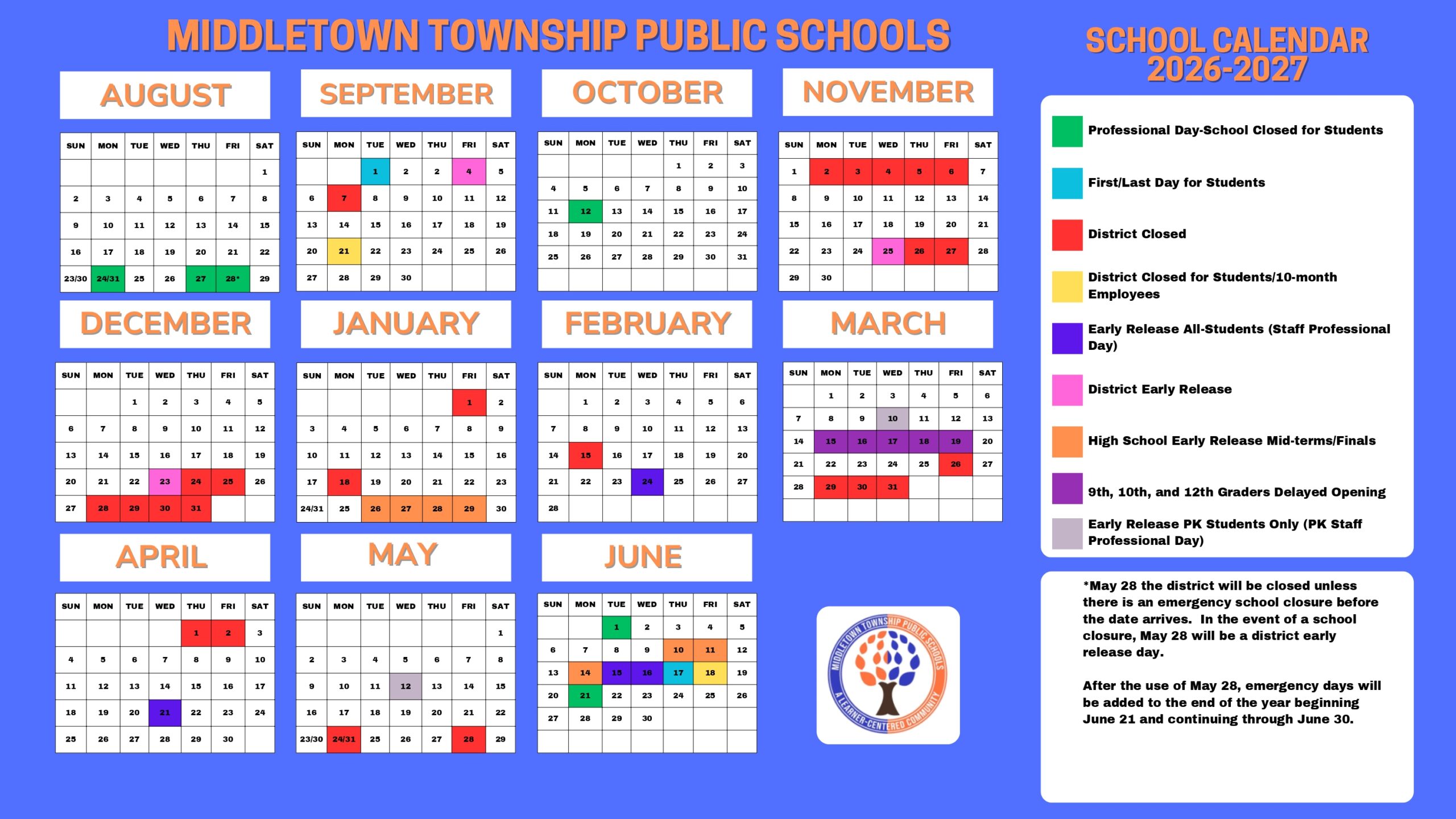 Dates are sourced from the official MIDDLETOWN TOWNSHIP PUBLIC SCHOOLS 26-27 Calendar [PDF] website. Dates may change at the discretion of the district. Always verify with the official school website for the latest updates.