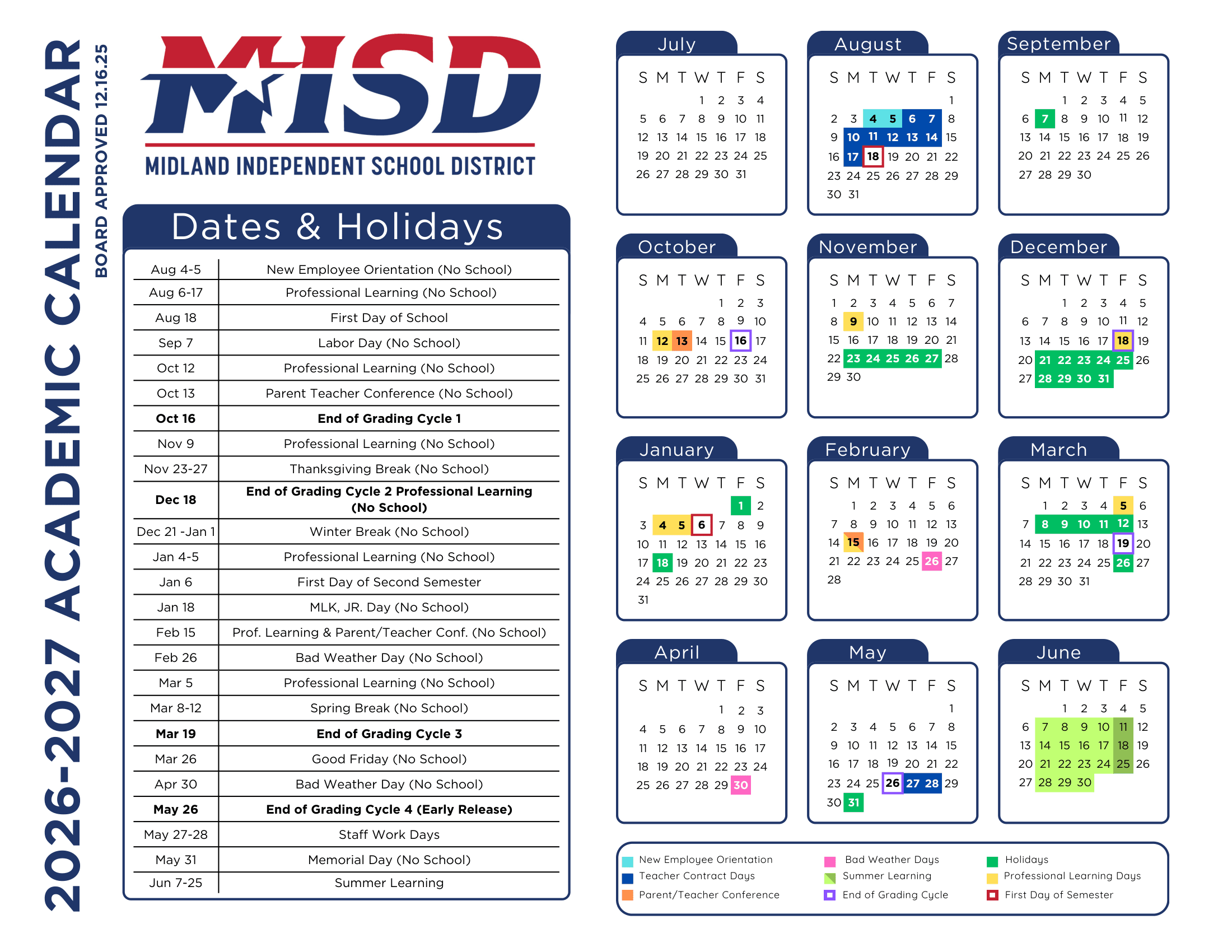 Dates are sourced from the official Midland Independent School District 26-27 Calendars [PDF] website. Dates may change at the discretion of the district. Always verify with the official school website for the latest updates.
