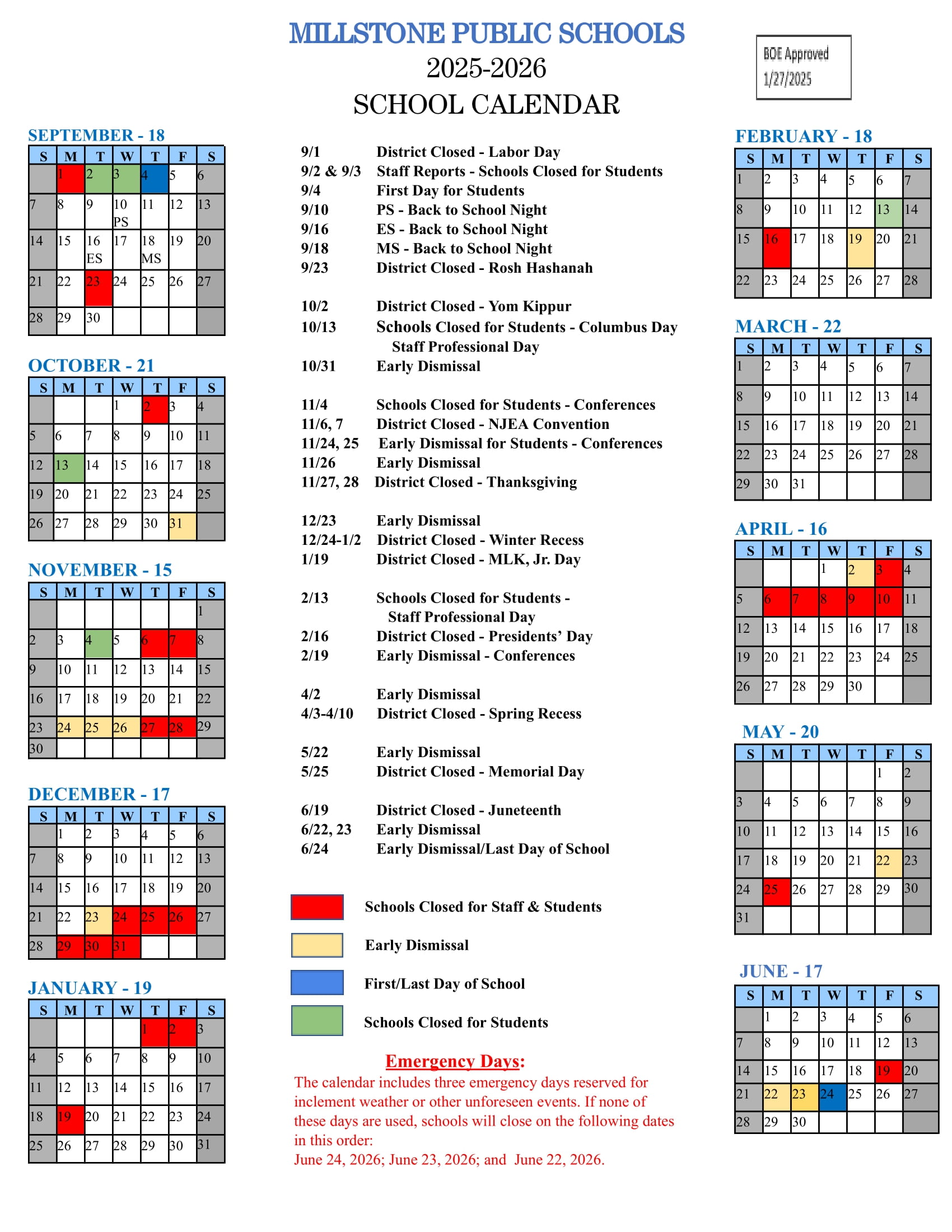 MILLSTONE PUBLIC SCHOOLS Calendar (2025-2026)