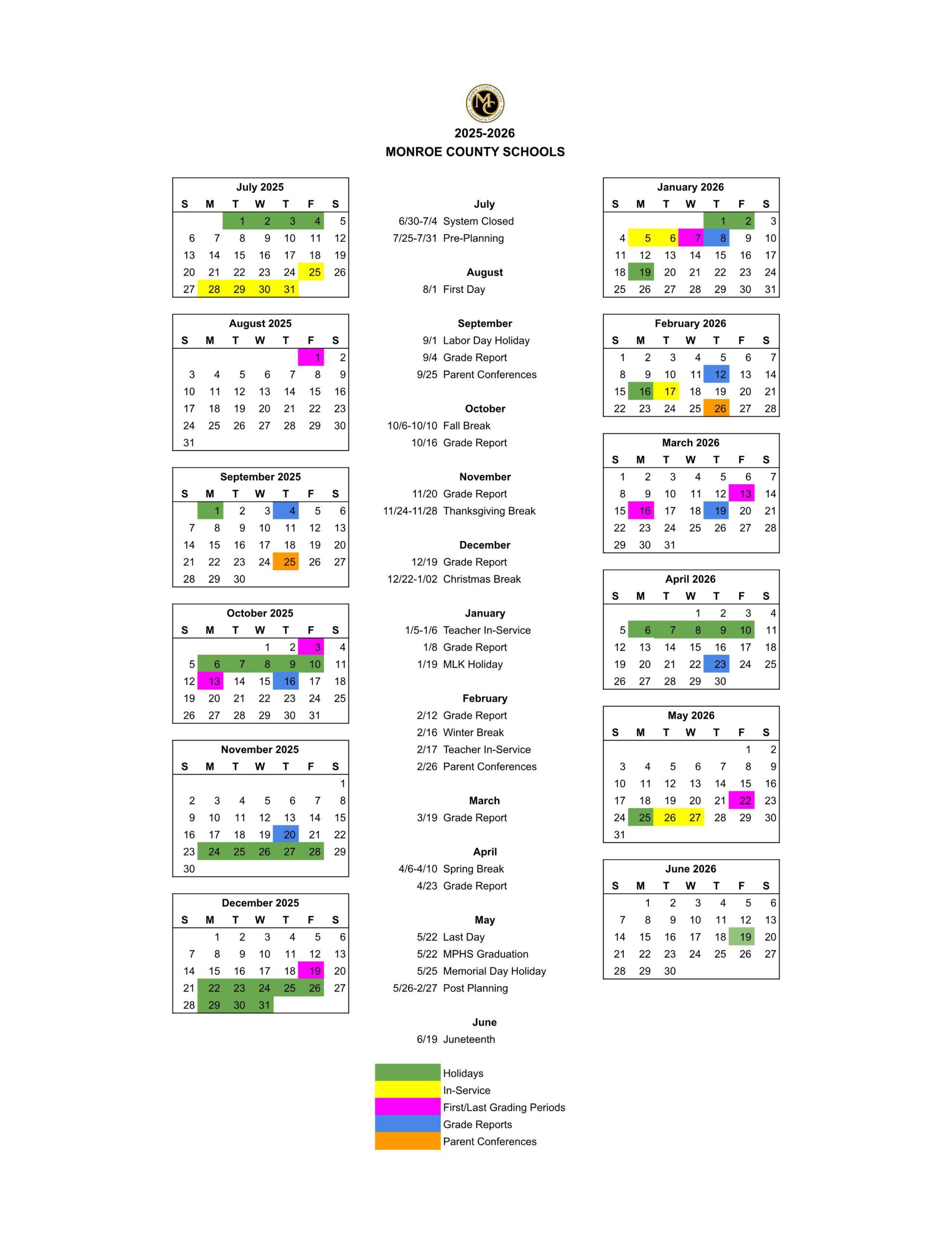 Monroe County Schools Calendar (2025-2026)