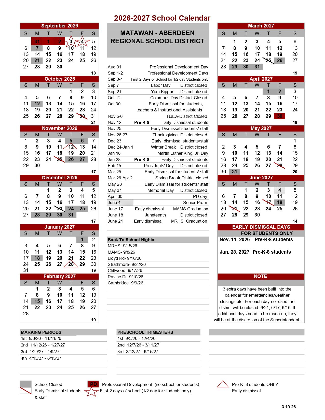 Dates are sourced from the official Montgomery Township School District Calendar 26-27 Updates website. Dates may change at the discretion of the district. Always verify with the official school website for the latest updates.