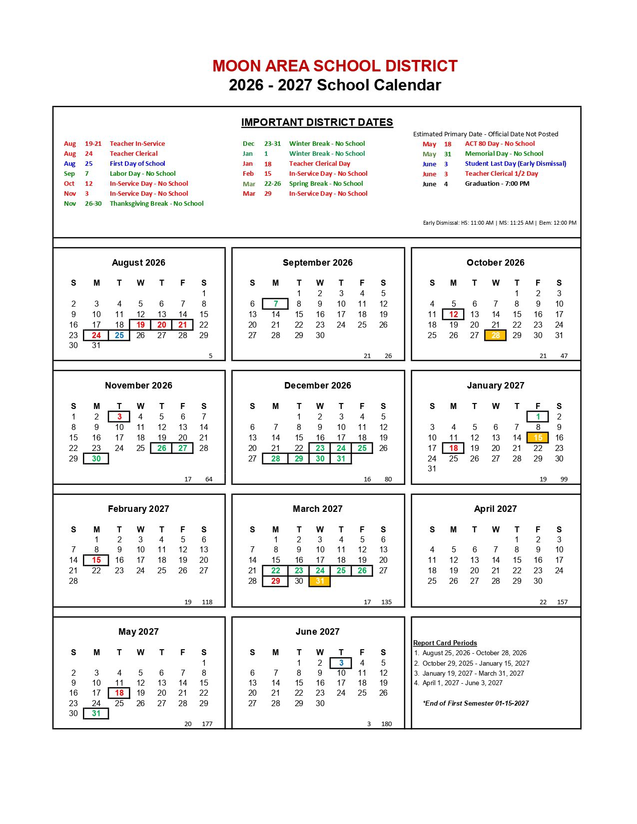 Dates are sourced from the official Moon Area School District Calendar 26-27 [PDF] website. Dates may change at the discretion of the district. Always verify with the official school website for the latest updates.