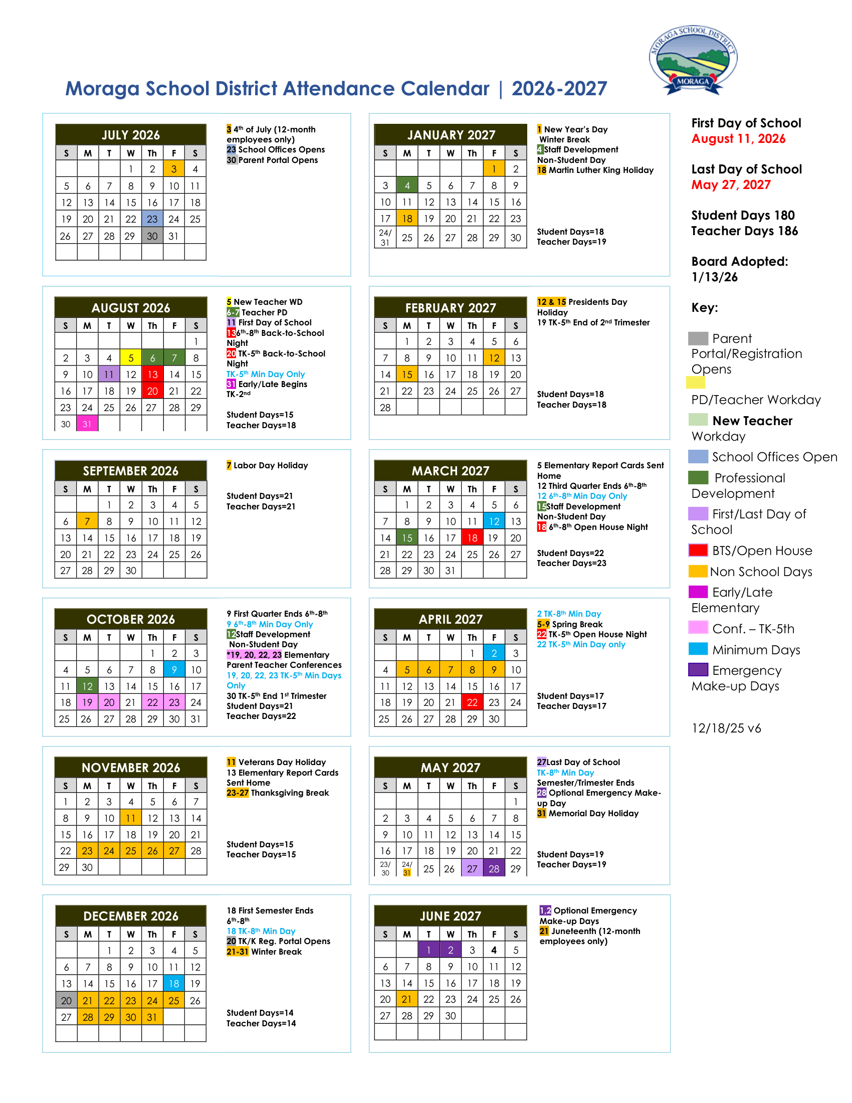 Dates are sourced from the official Moraga school district 26-27 Calendar [pdf[ website. Dates may change at the discretion of the district. Always verify with the official school website for the latest updates.