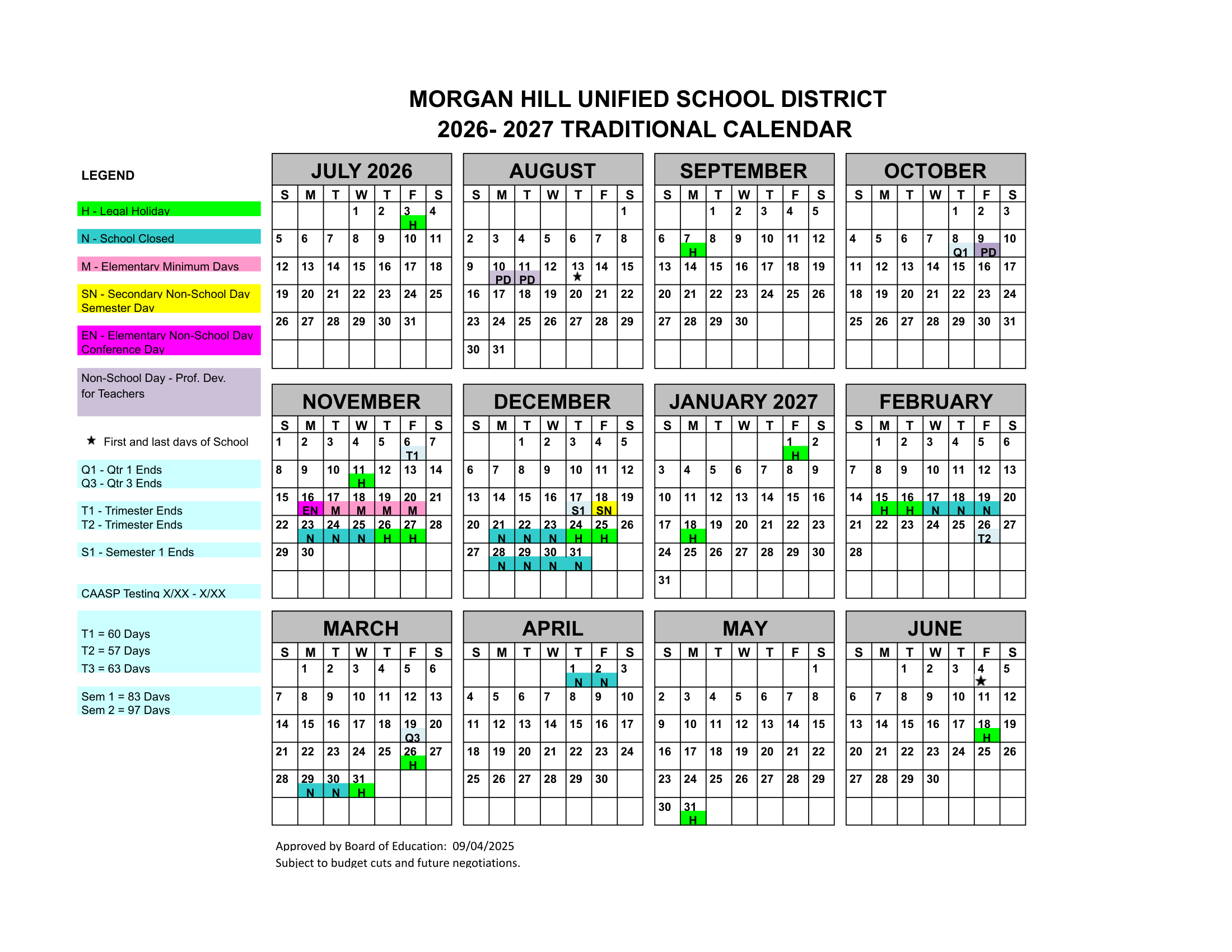 Morgan Hill Unified School District Calendar (2026-2027)