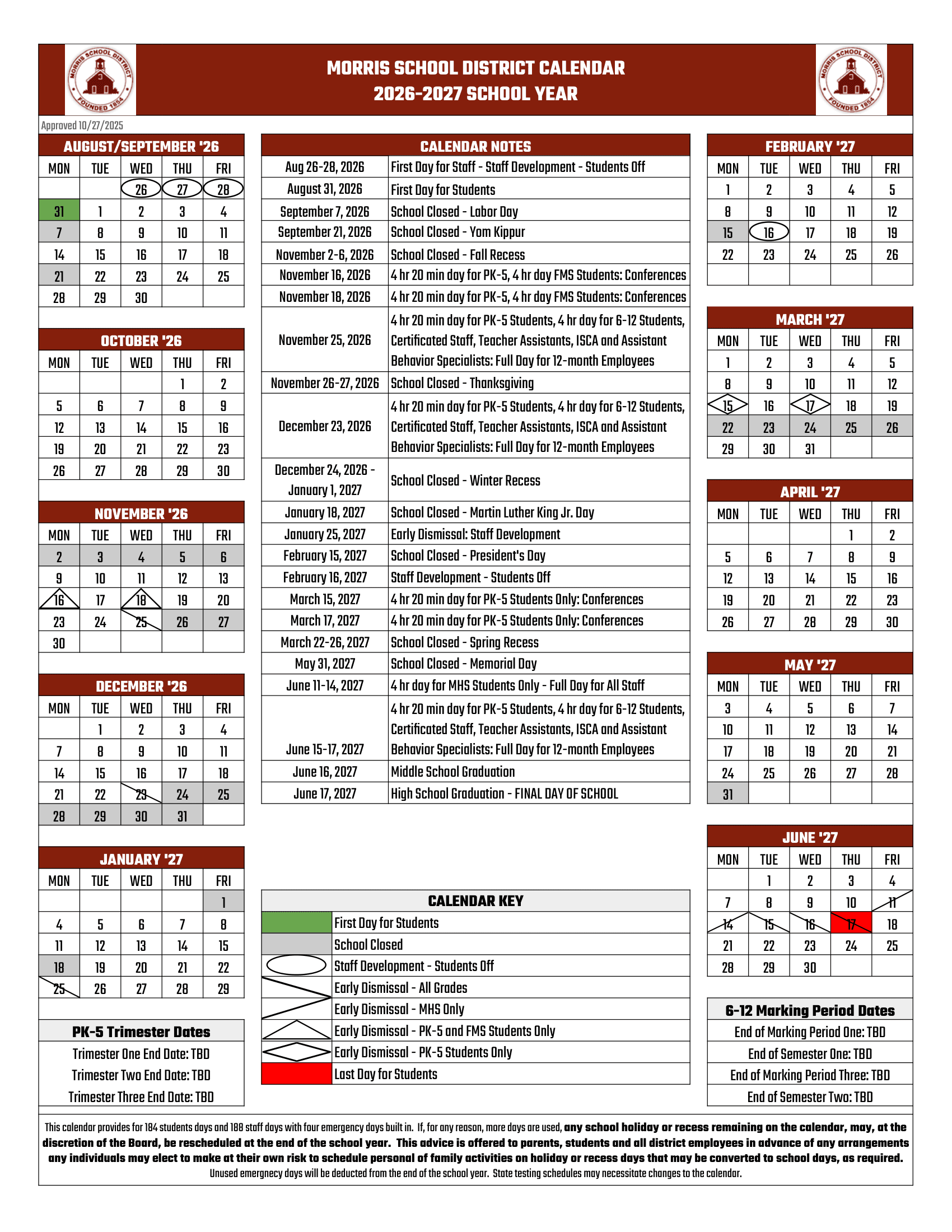 Dates are sourced from the official Morris School District NJ Calendar 26-27 Revised [pdf] website. Dates may change at the discretion of the district. Always verify with the official school website for the latest updates.