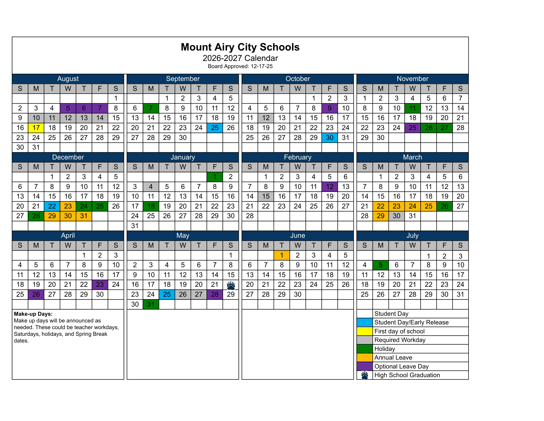 Dates are sourced from the official Mount Airy City Schools NC 26-27 Calendar [PDF] Updates website. Dates may change at the discretion of the district. Always verify with the official school website for the latest updates.