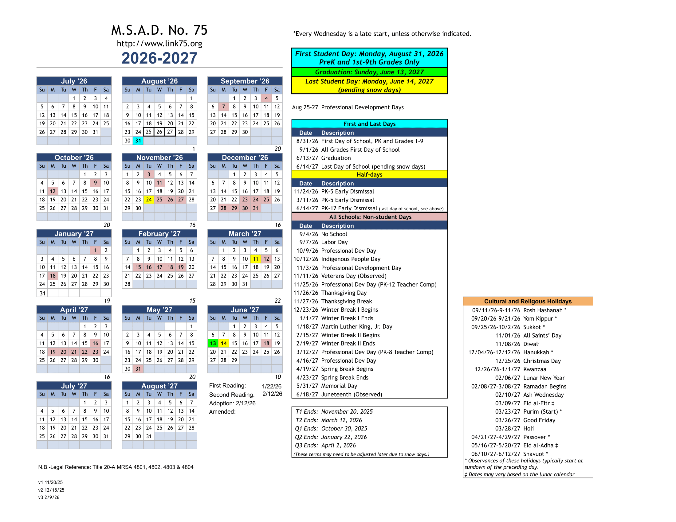 M.S.A.D. No. 75 Calendar (2026-2027)