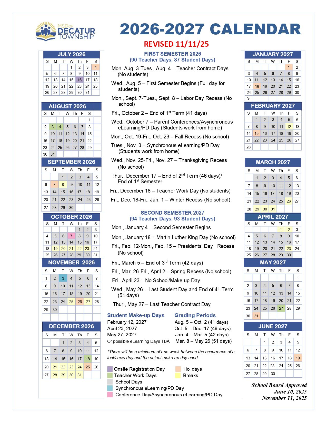 MSD of Decatur Township Calendar (2026-2027)