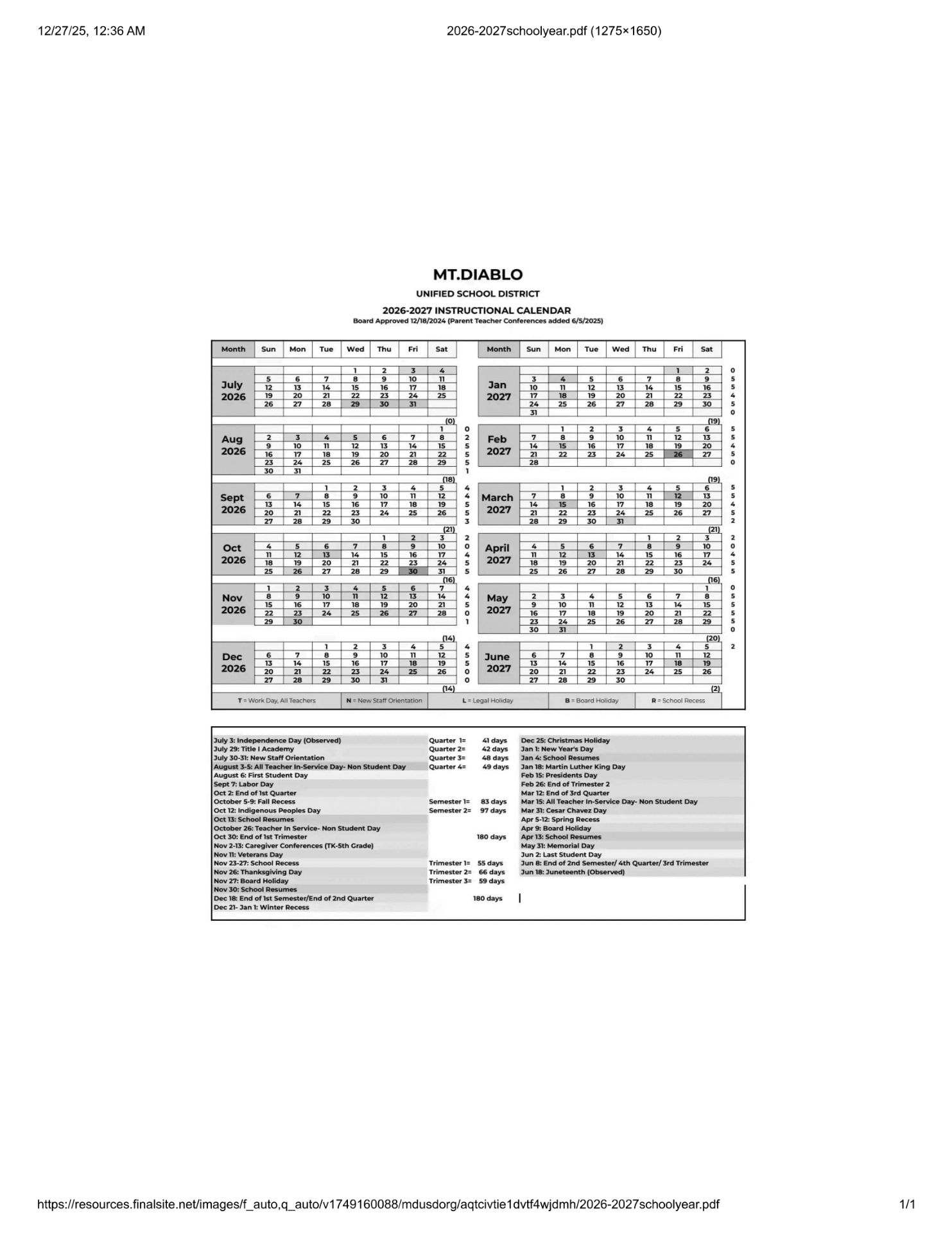 The school Term Dates shown on this page has been sourced directly from the official Mt Diablo Unified School District Calendar 26-27 Revised PDF website. Please be aware that all dates and events may be amended at the discretion of the school, state, District or County. For the most up-to-date and accurate information, we recommend checking the official council website or contacting the school office.