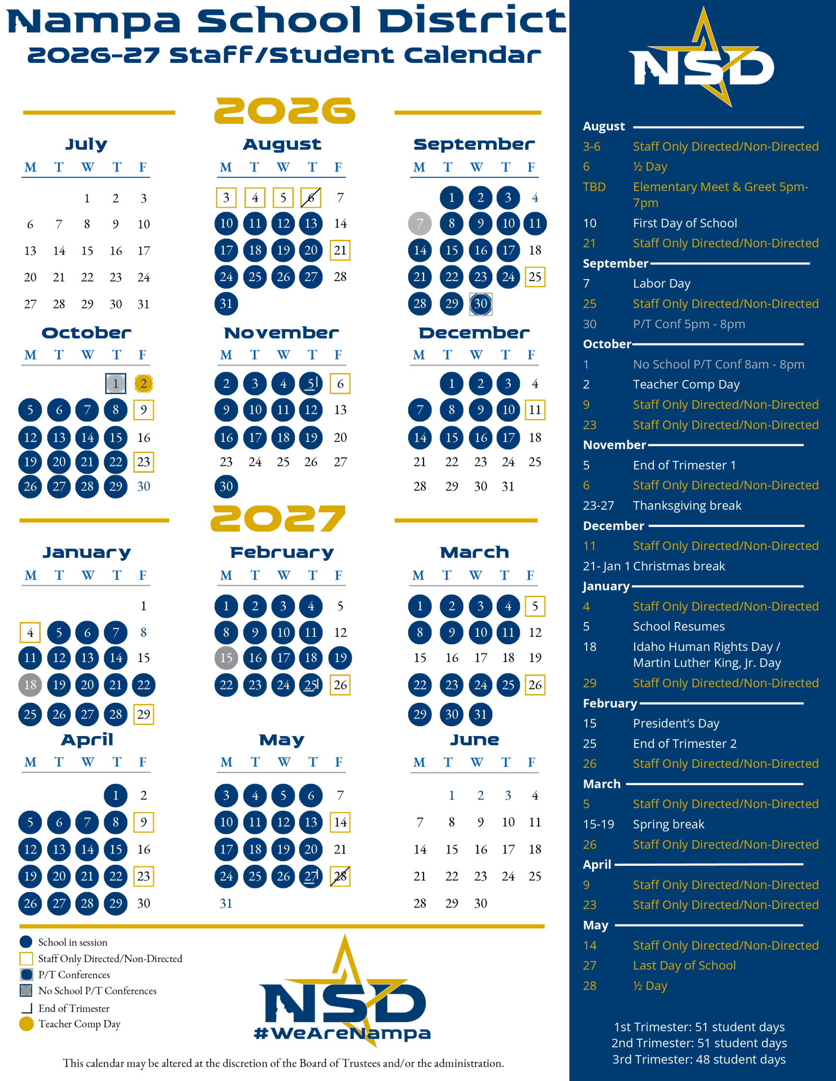 Dates are sourced from the official Nampa School District 26-27 Calendar [PDF] website. Dates may change at the discretion of the district. Always verify with the official school website for the latest updates.