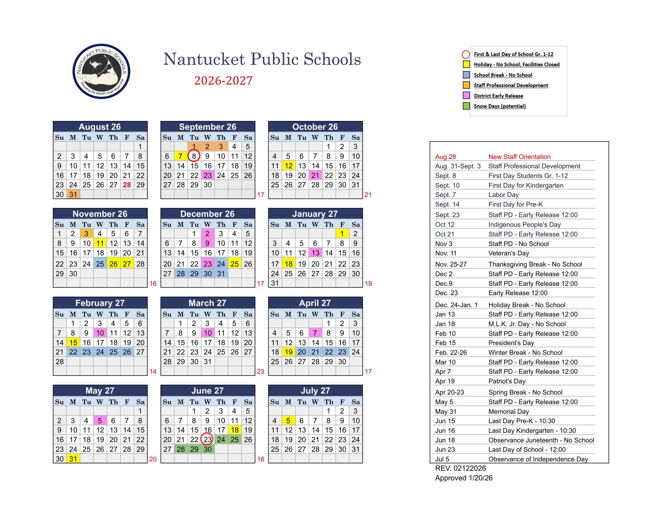 Nantucket Public Schools Calendar (2026-2027)