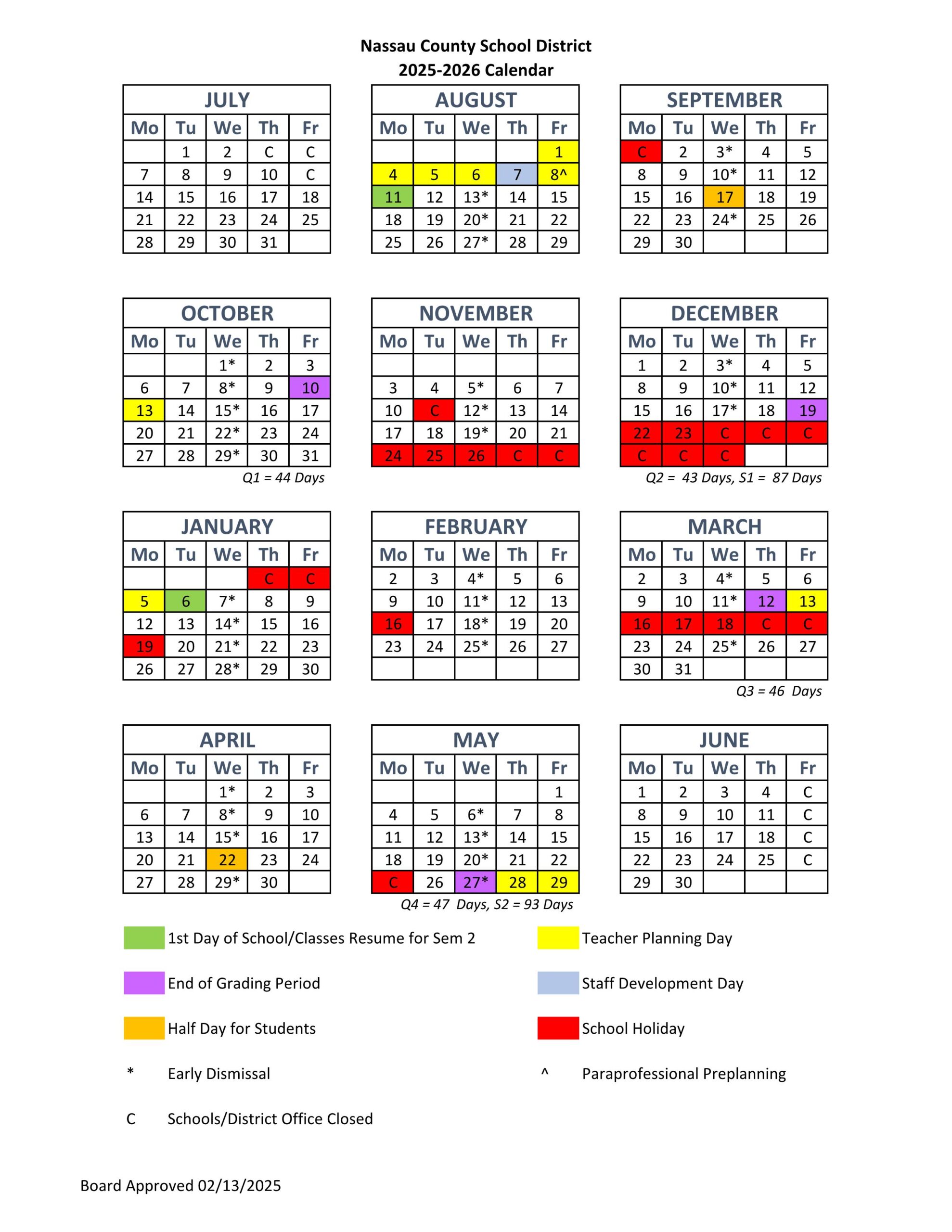 The school calendar provided on this page is taken from the official Nassau County School District website. Please note that all dates and events are subject to change at the discretion of the school district. For the most accurate and updated information, please refer to the official district website or contact the school helpline.