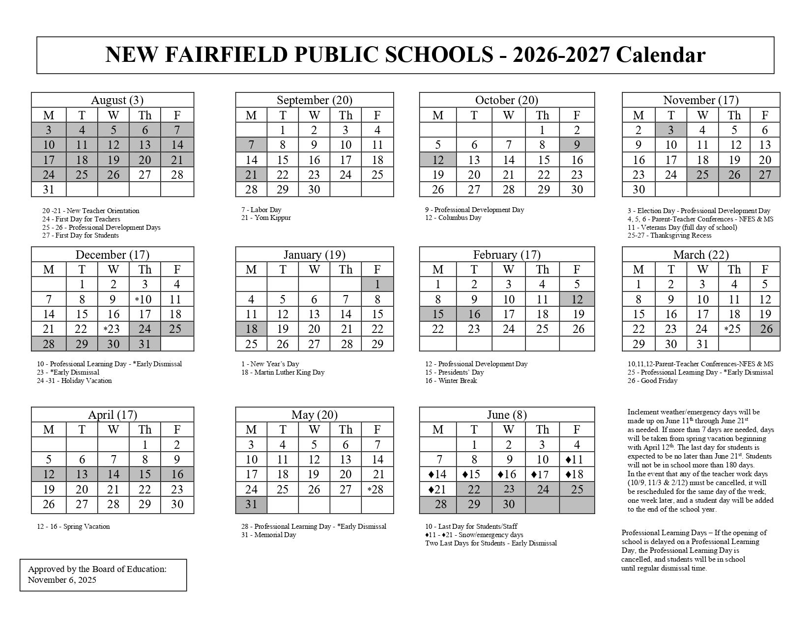 NEW FAIRFIELD PUBLIC SCHOOLS Calendar (2026-2027)