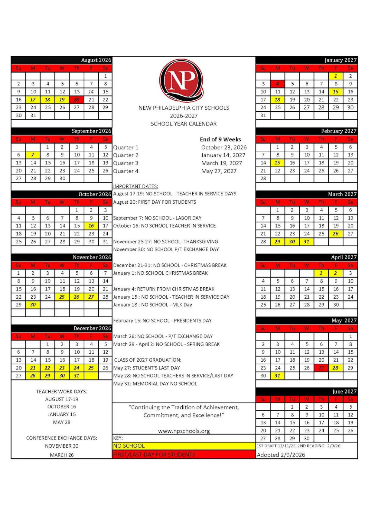 The Printable school calendar provided on this page is taken from the official NEW PHILADELPHIA CITY SCHOOLS 26/27 Updated. Please note that all dates and events are subject to change at the discretion of the school district. For the most accurate and updated information, please refer to the official district website or contact the school helpline.