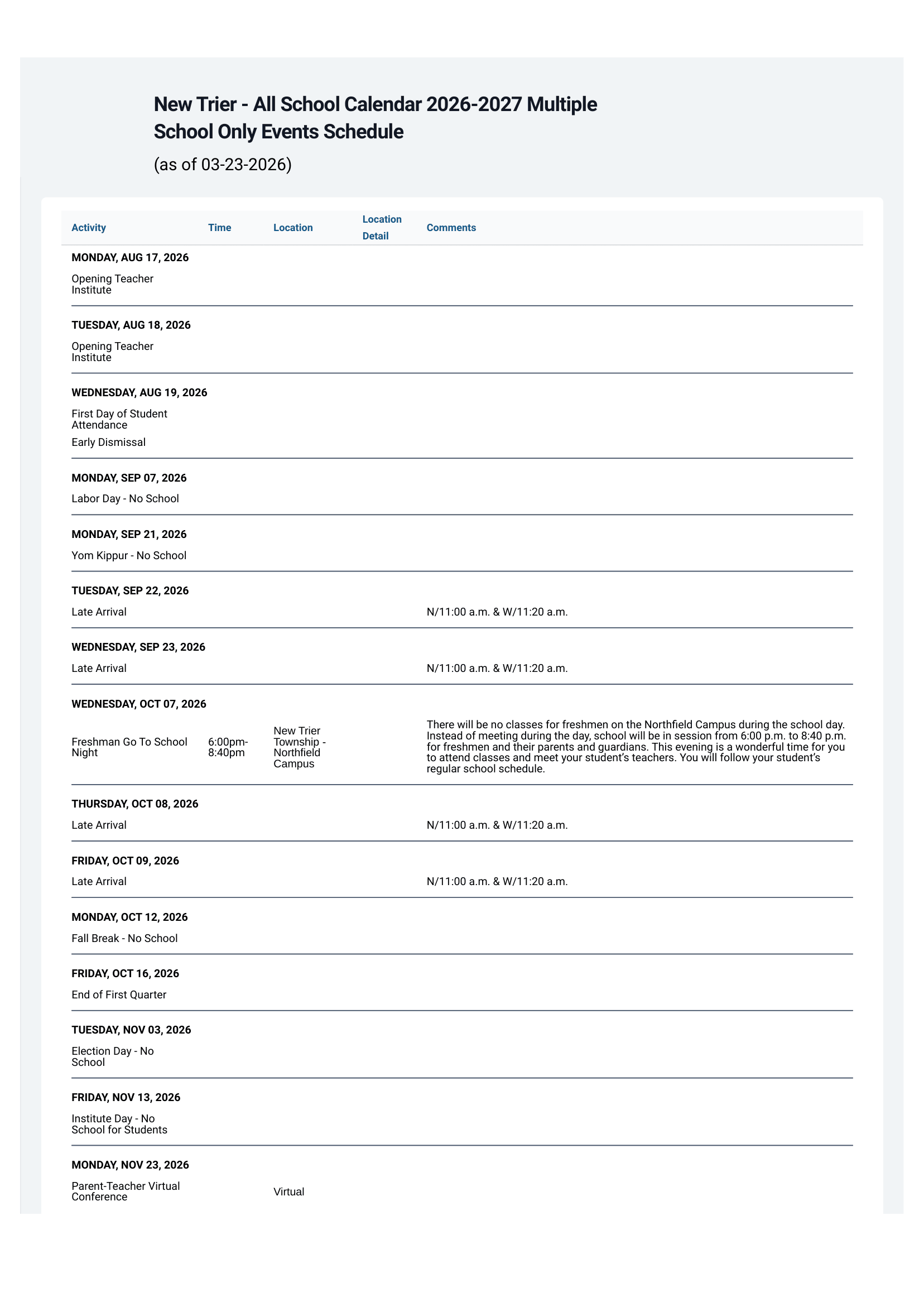 Dates are sourced from the official New Trier Township High School District 203 Calendar 26-27 [PDF] website. Dates may change at the discretion of the district. Always verify with the official school website for the latest updates.