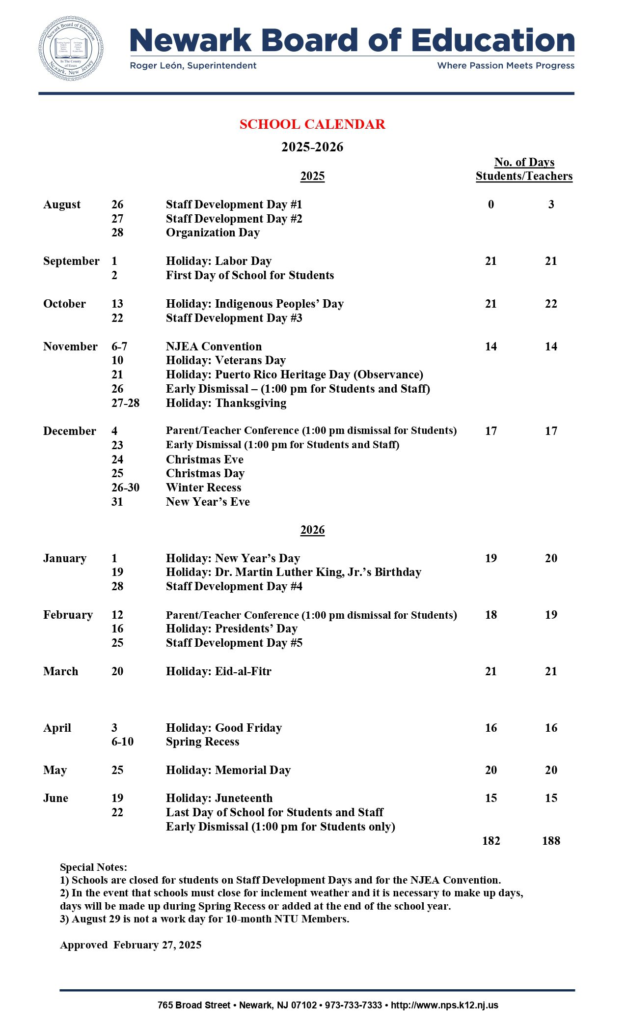 Newark Board of Education Calendar (2025-2026)