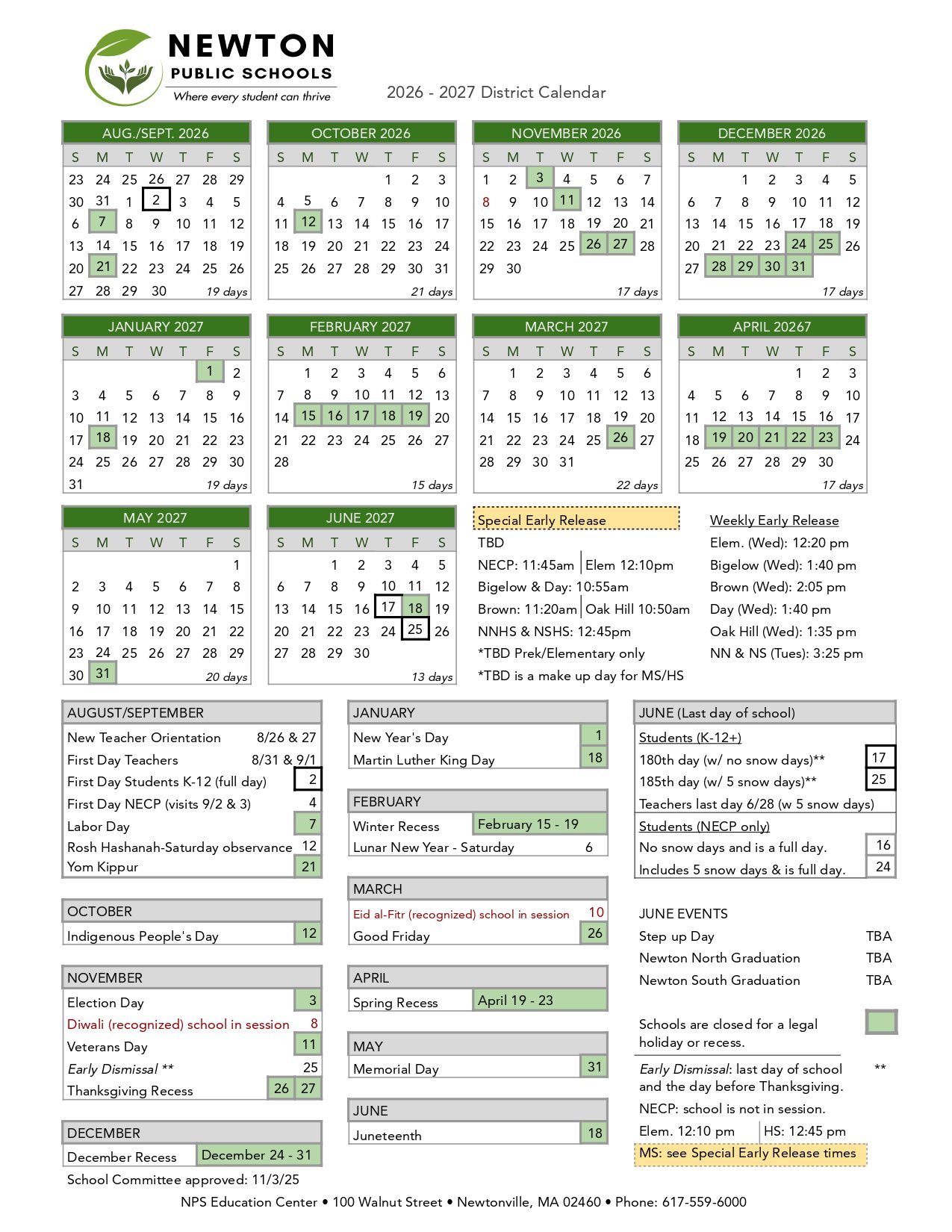 Dates are sourced from the official Newton Public Schools MA Calendar 26-27 [PDF] website. Dates may change at the discretion of the district. Always verify with the official school website for the latest updates.