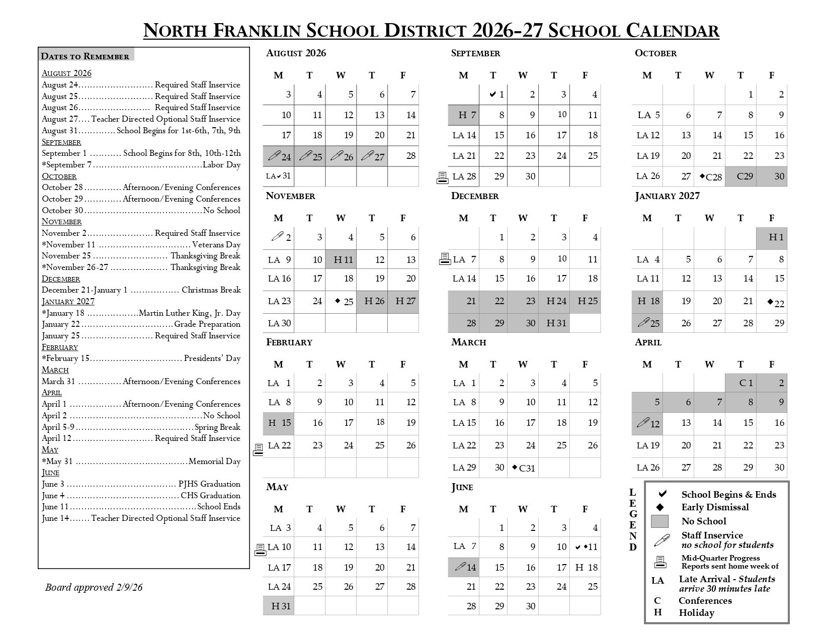 North Franklin School District Calendar (2026-2027)