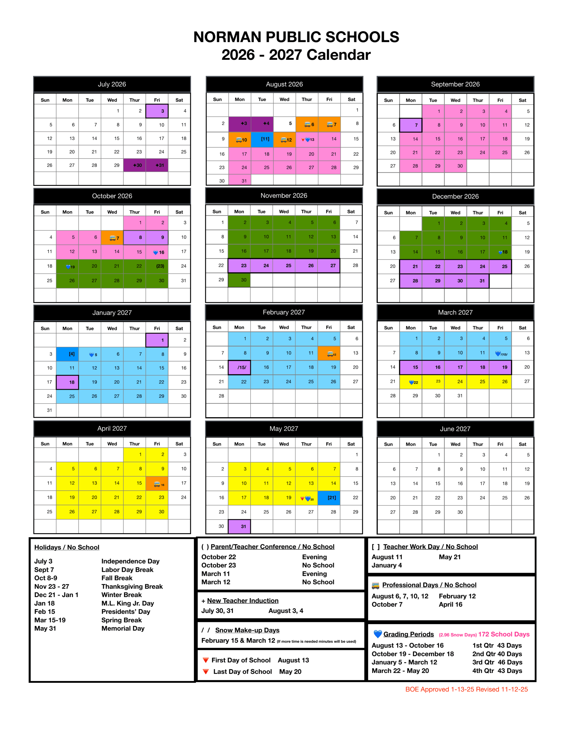 Norman Public Schools has 172 instructional days in the 2026–2027 school year.