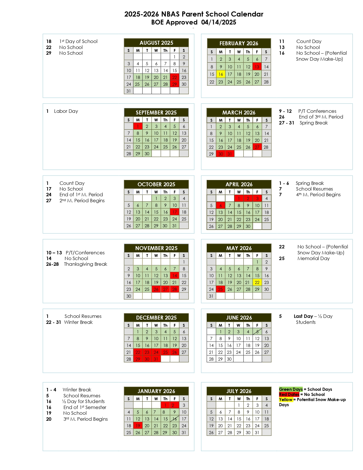 In addition to breaks, there is no school on Labor Day (September 1, 2025), a non-school day (January 19, 2026), and Memorial Day (May 25, 2026). There are also potential snow day make-up days on February 22, 2026, and May 25, 2026.