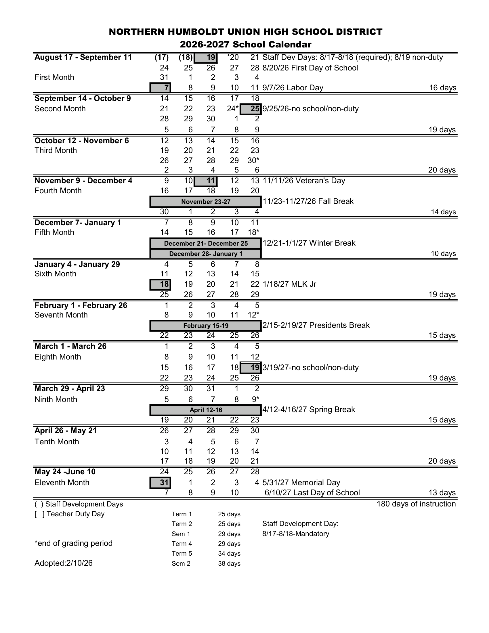 Dates are sourced from the official Northern Humboldt Union High School District 26-27 Calendar Updated [PDF] website. Dates may change at the discretion of the district. Always verify with the official school website for the latest updates.