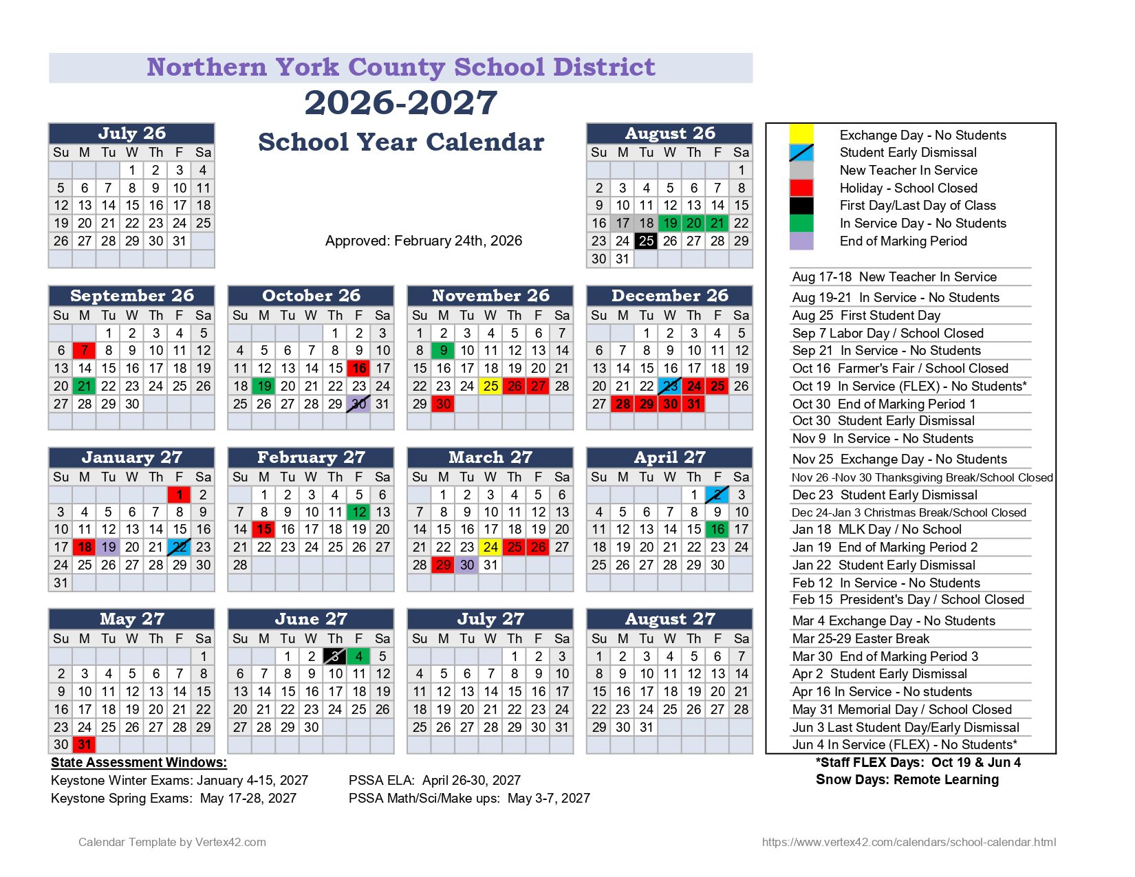 The Printable school calendar provided on this page is taken from the official Northern York County School District PA Calendar 26-27 Updates. Please note that all dates and events are subject to change at the discretion of the school district. For the most accurate and updated information, please refer to the official district website or contact the school helpline.