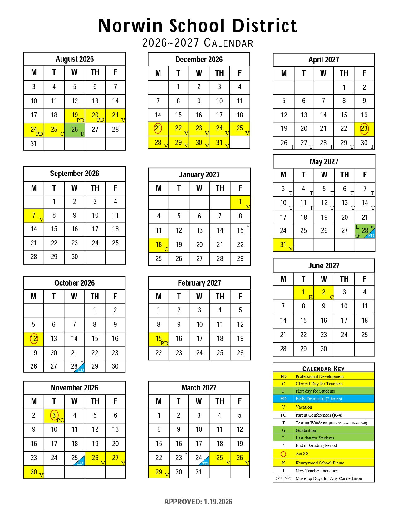 Dates are sourced from the official Norwin School District Calendar pa 26-27 Revised PDF website. Dates may change at the discretion of the district. Always verify with the official school website for the latest updates.