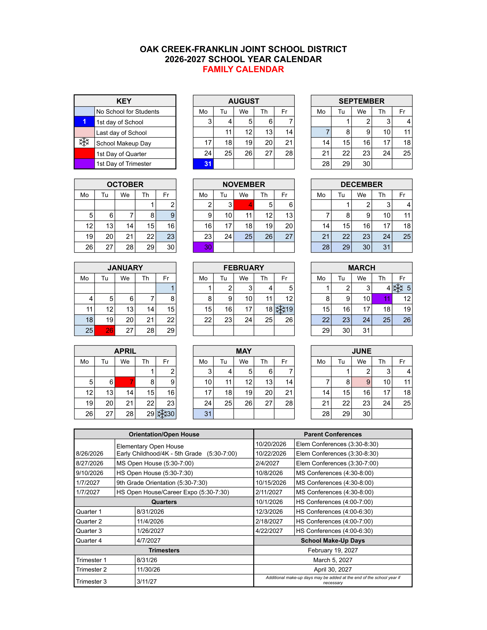 OAK CREEK-FRANKLIN JOINT SCHOOL DISTRICT Calendar (2026-2027)