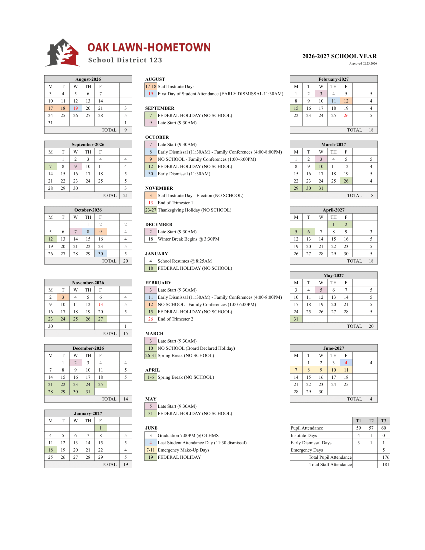 Oak Lawn-Hometown School District 123 Calendar (2026-2027)
