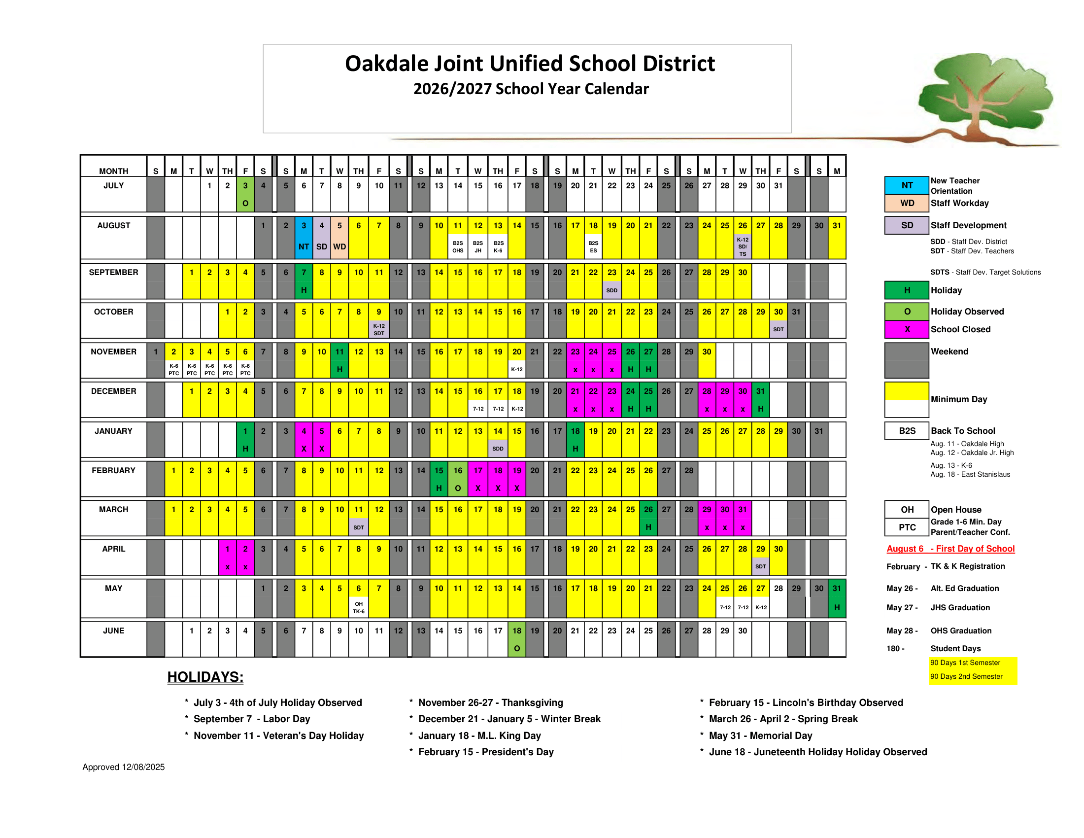 Oakdale Joint Unified School District Calendar (2026-2027)