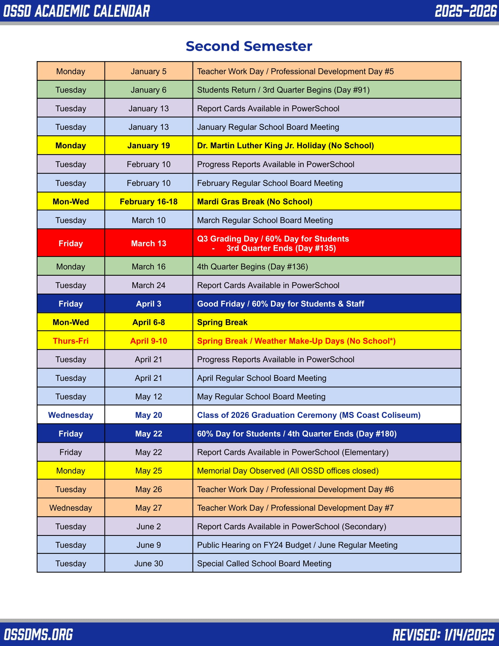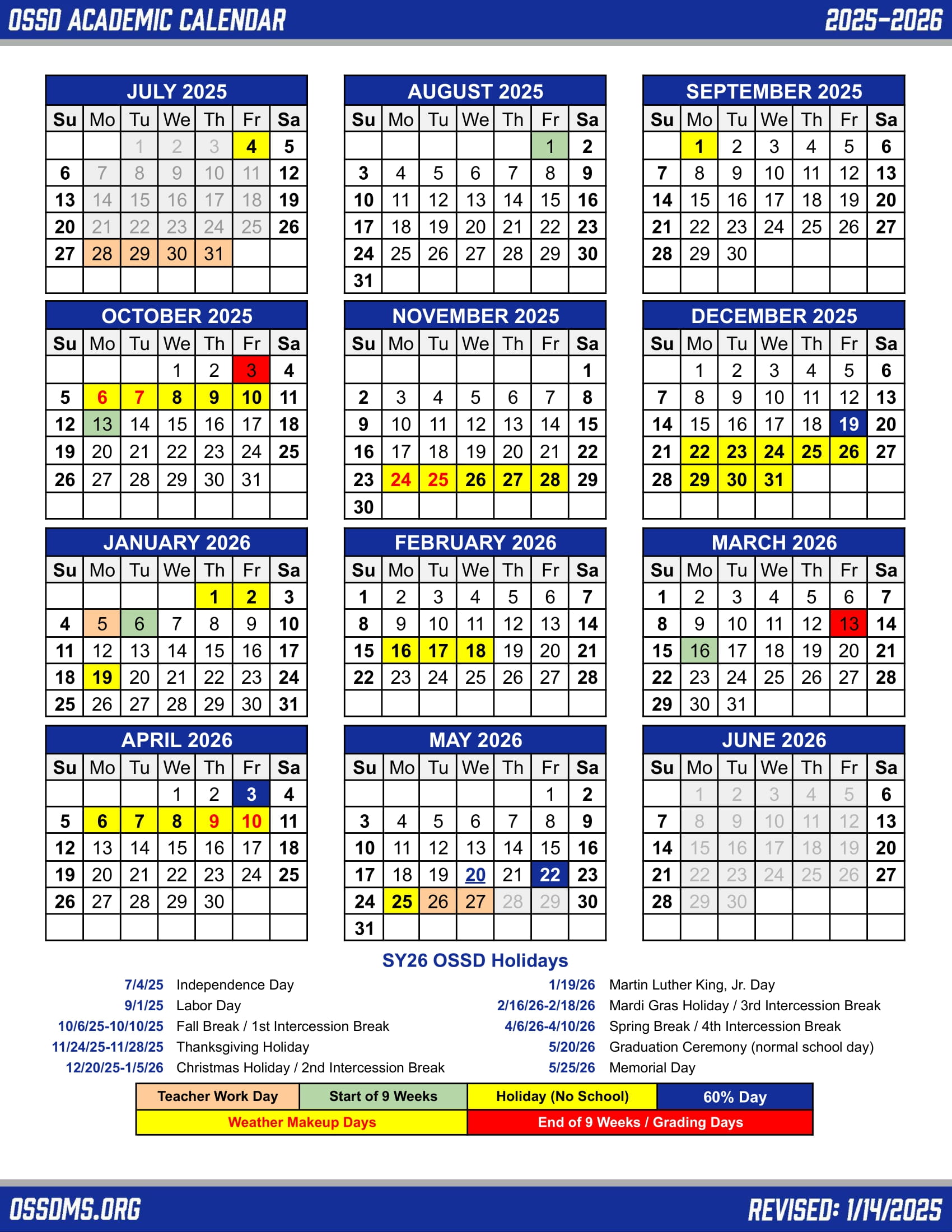 May 25, 2026 | Memorial Day Observed (All OSSD offices closed) |