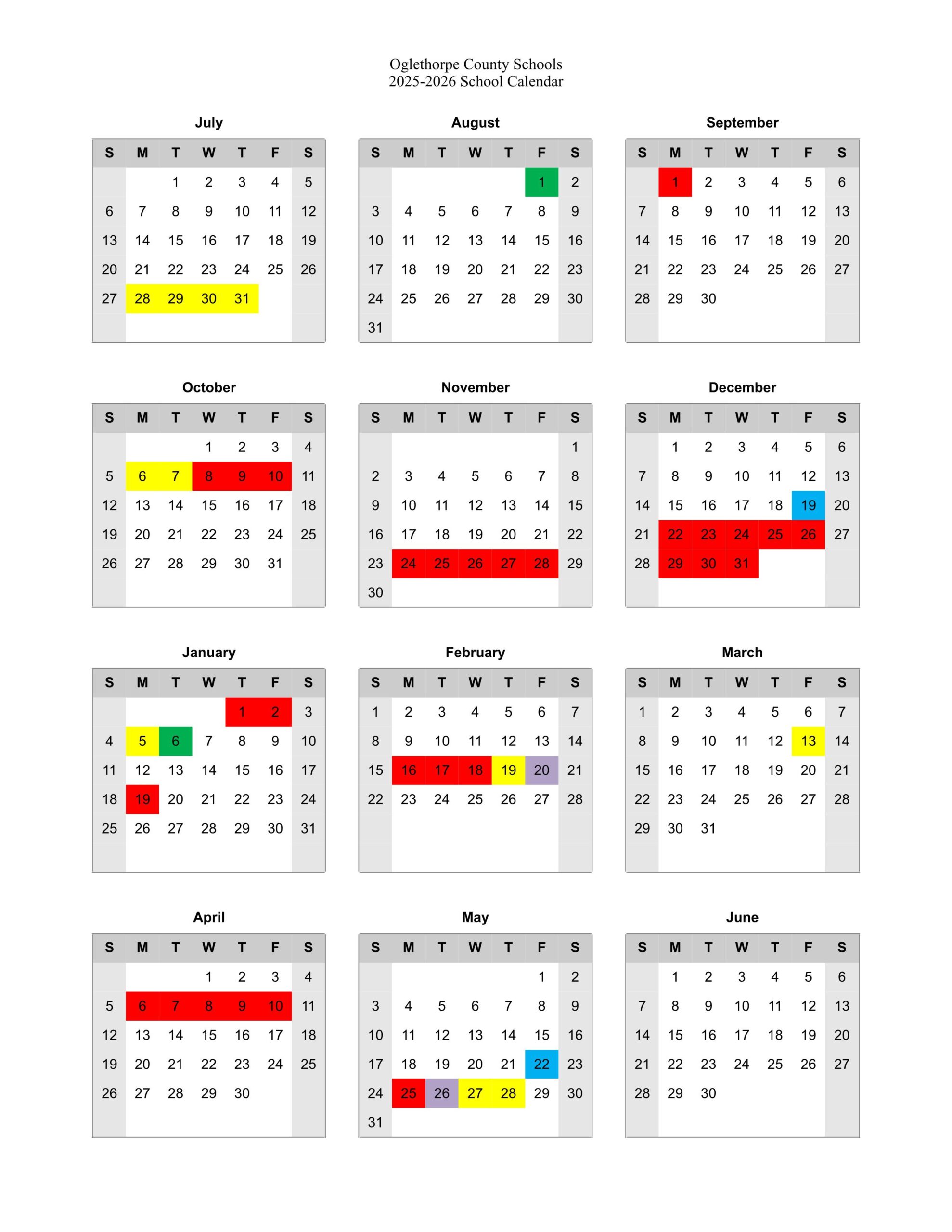 The school calendar provided on this page is taken from the official Oglethorp County GA School District website.