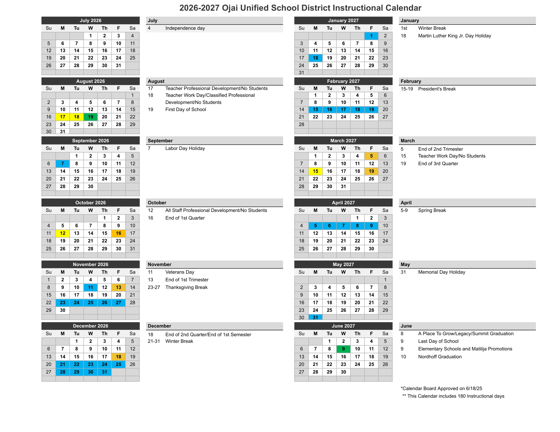Dates are sourced from the official Ojai Unified School District 26-27 Calendar website. Dates may change at the discretion of the district. Always verify with the official school website for the latest updates.