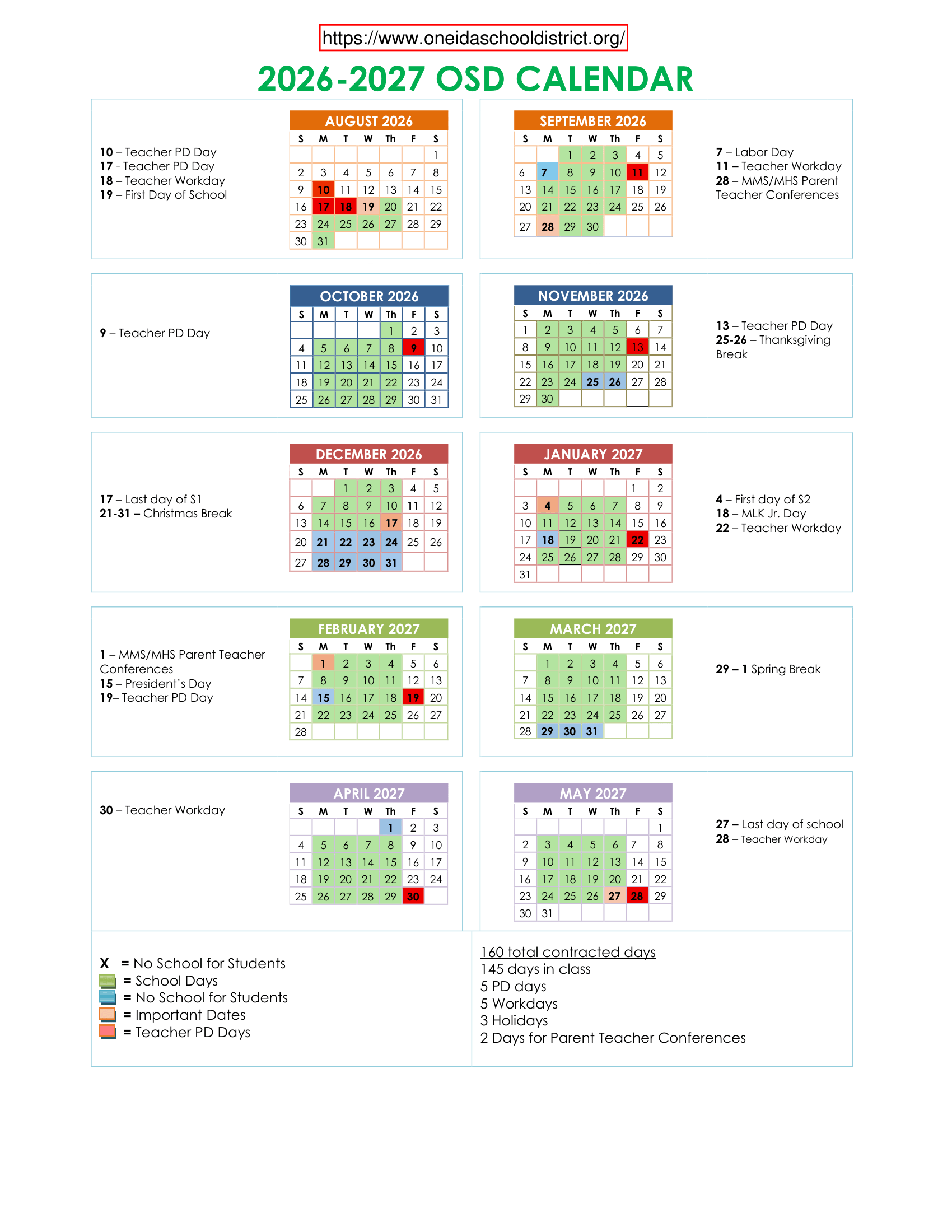 Dates are sourced from the official Oneida School District 26-27 Calendar [PDF] website. Dates may change at the discretion of the district. Always verify with the official school website for the latest updates.