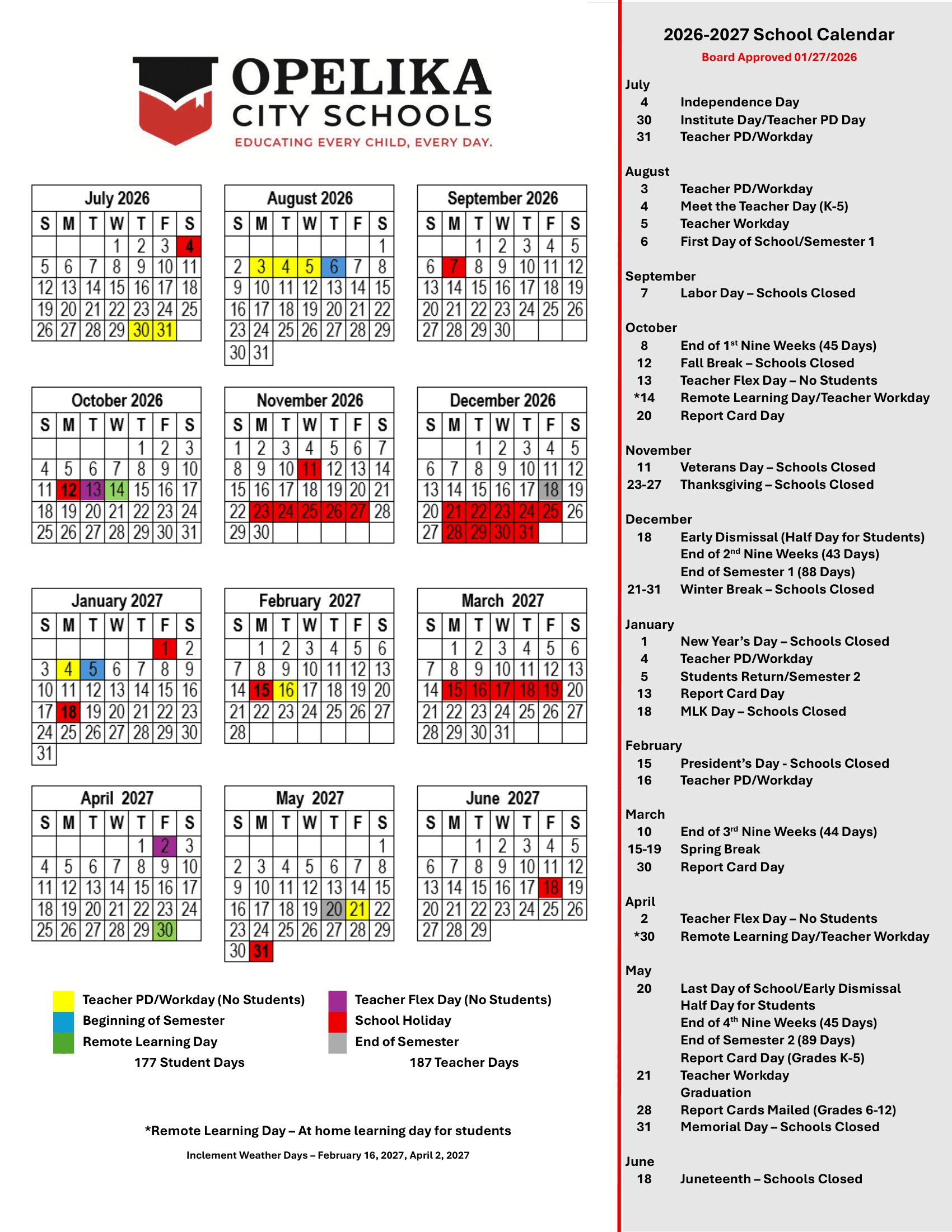 Opelika City Schools Calendar (2026-2027)