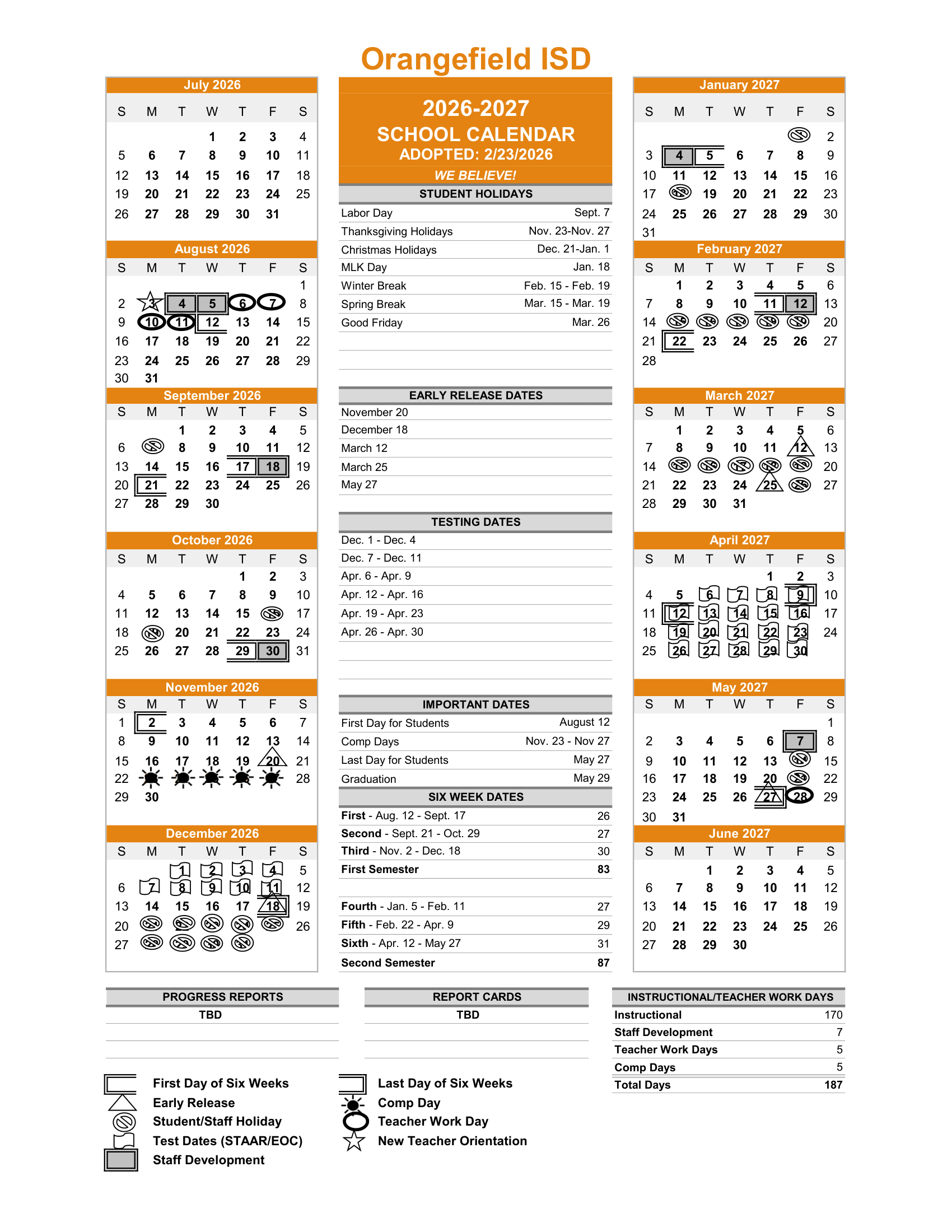 Orangefield ISD Calendar (2026-2027)