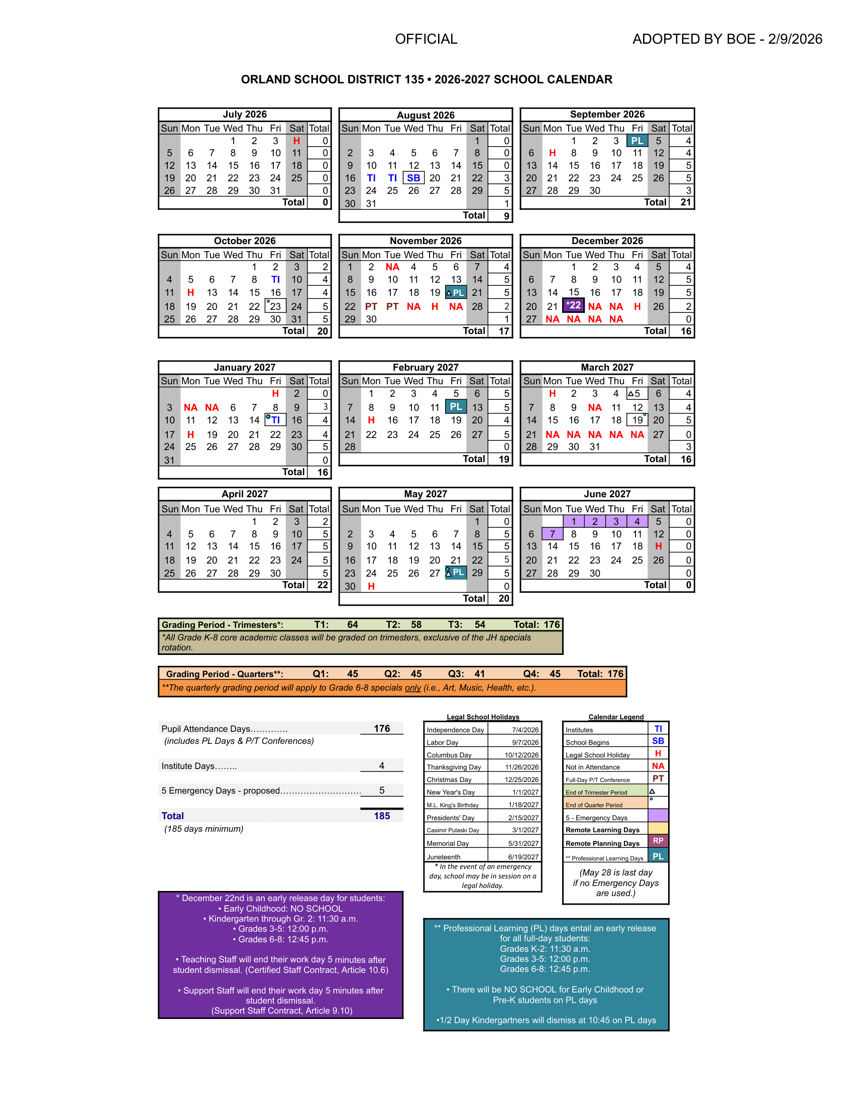 Orland School District 135 Calendar (2026-2027)