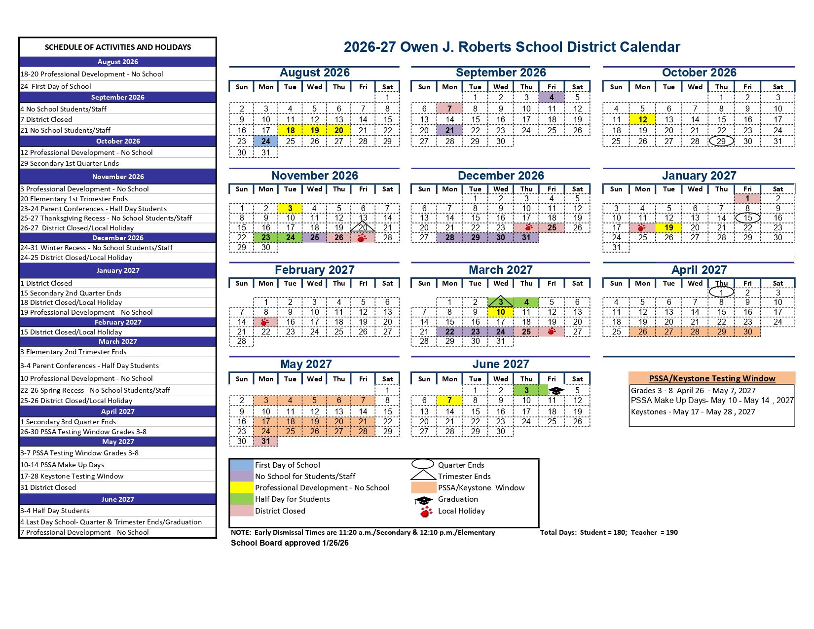 Dates are sourced from the official Owen J. Roberts School pa Calendar 26-27 Revised PDF website. Dates may change at the discretion of the district. Always verify with the official school website for the latest updates.